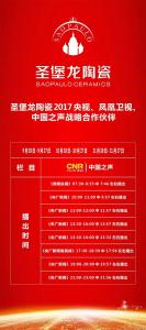 陶瓷十大品牌圣堡龍?zhí)沾?2小時(shí) 720分鐘?國(guó)家廣播媒體,助力中國(guó)大家居品牌圣堡龍?zhí)沾梢惶熘?jì)在于晨,金秋9月,圣堡龍?zhí)沾梢灿瓉砹税l(fā)展的新篇章。2017年9月18日早高峰,《新聞