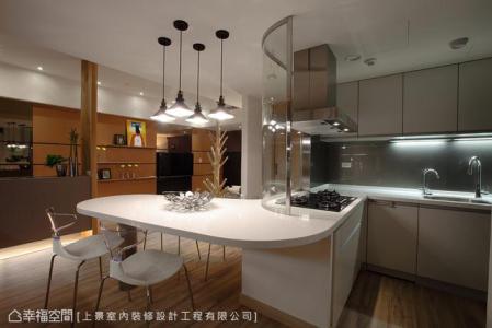 以軟裝布置出個性空間,墻上壁燈來自法國,提供照明情境又具裝飾功能。三條溝縫為層板軌道,讓年輕夫妻可以自由變換居家風(fēng)景。密集板創(chuàng)意變身裝飾面,線條修飾中更巧妙隱藏兩個出入口。混搭茶鏡材質(zhì),讓空間有反射及