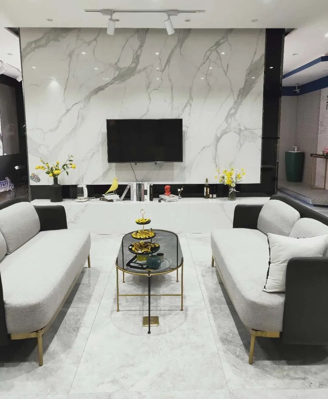 走進(jìn)簡(jiǎn)潔明亮的現(xiàn)代客廳,就被這款連紋大板種草了。1200*2400mm超大規(guī)格,三片連紋無(wú)縫銜接,詮釋天然石材之美,高顏值,大視界,大氣派。
