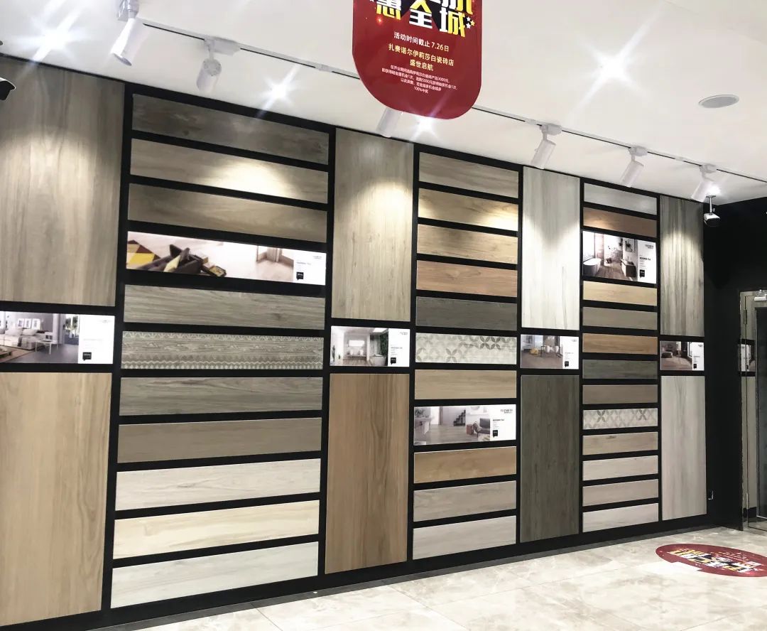 This is a modern ceramic tile museum with multiple categories. Walking into the corridor of the material selection area, you can see the marble tiles, artistic wall tiles, modern porcelain wood and modern antique brick with different colors and specifications. Open and bright product elements display area, with the most intuitive visual experience of each ceramic tile product texture changes and texture.