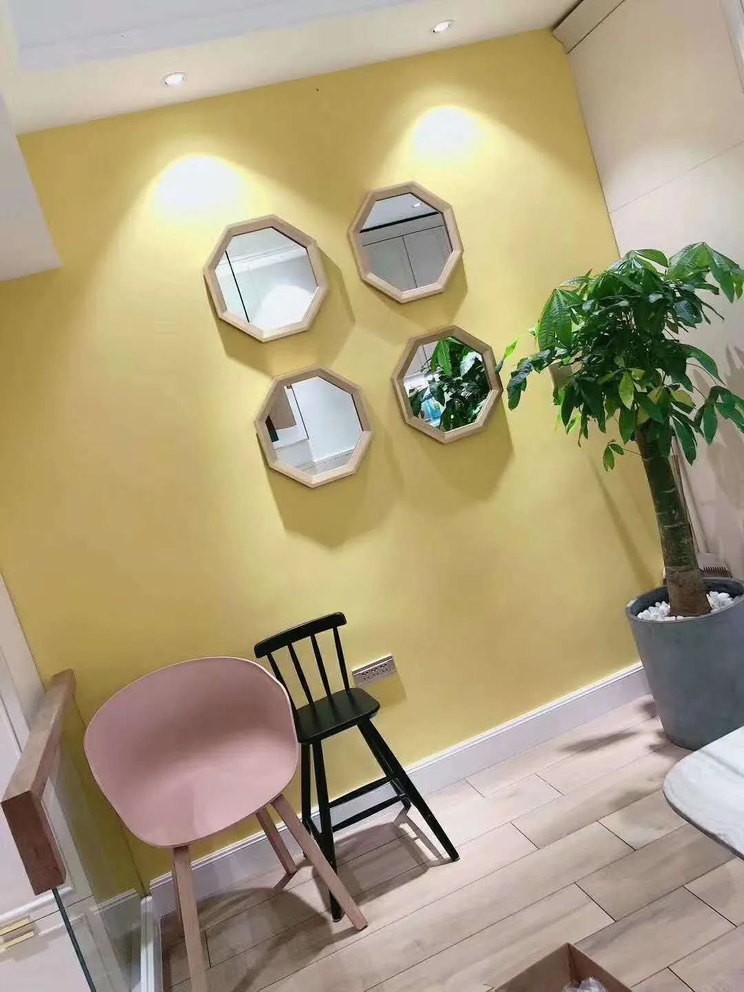 The big basin green plant of corner place is permeated with natural breath, match together with the floor tile of log element, simple and beautiful.
