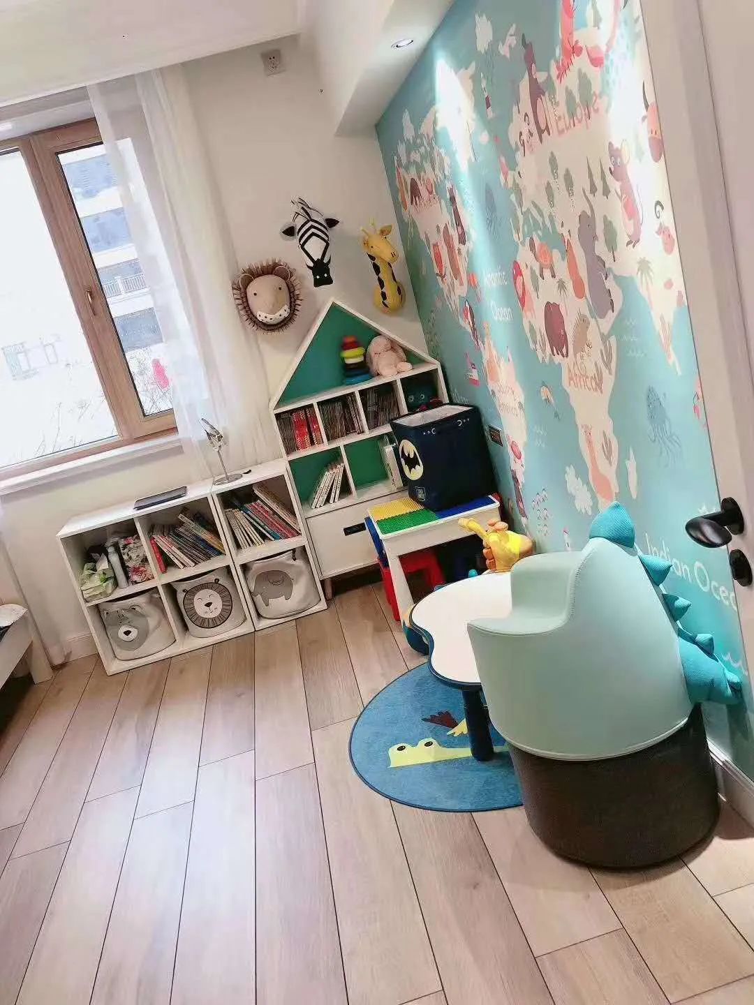 Wall flour blue adornment sets big fundamental key for children room, the chair of dinosaur modelling is very lovely, it is the room absolutely "exterior level bears" let a person fall in love with at a glance.