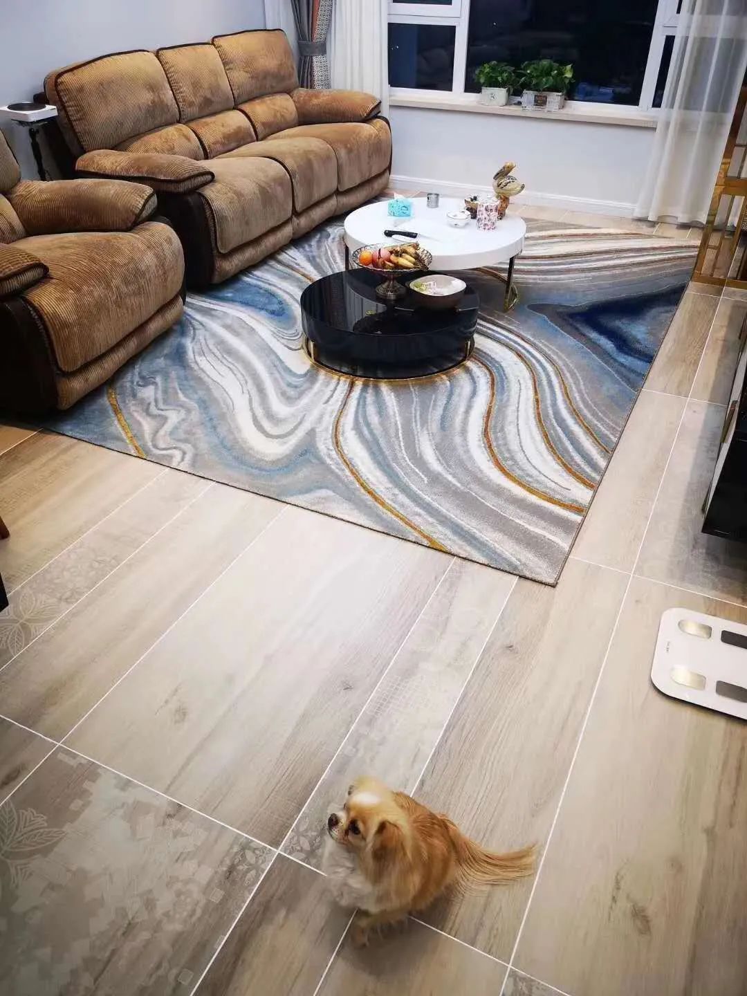 客廳的設(shè)計十分溫馨,大地色的沙發(fā)精心搭配上簡約的茶幾,花色獨特的地毯在原木地磚的襯托下更是亮眼。一家?guī)卓冢瑖黄鹂措娨暬蚴钦勌煺f地,享受當(dāng)下時光。