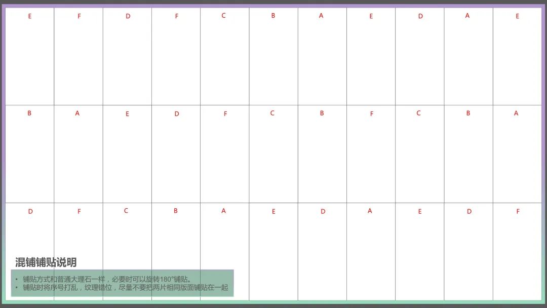 鋪貼時(shí)將序號(hào)打亂,紋理錯(cuò)位,盡量不要把兩片相同版面鋪貼在一起。