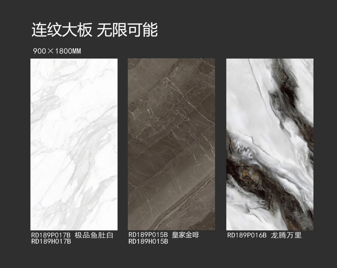 當(dāng)你第一眼看到ROMANTIC連紋大板,一定會(huì)驚詫于紋理飽滿激昂的張力,色彩的豐富層疊。其中900x1800mm規(guī)格無限連紋大板有「極品魚肚白」、「龍騰萬里」、「皇家金啡」三款,750x1500mm規(guī)格無限連紋大板有「柏迪斯」、「極品魚肚白」、「奧爾特灰」。