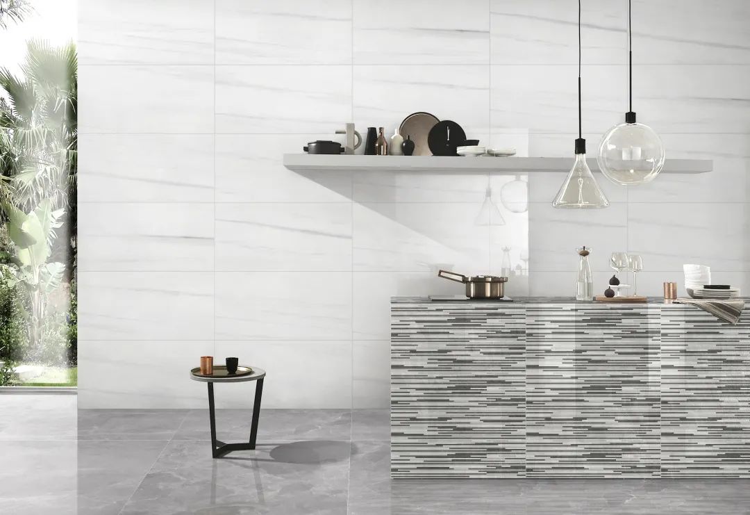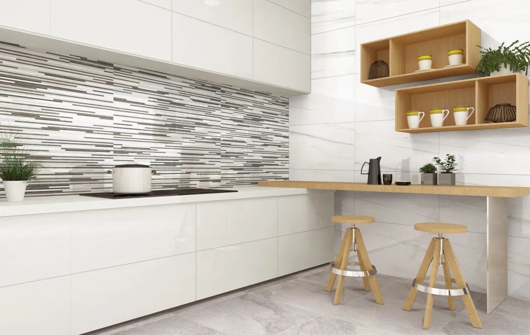 "Star white" decorate kitchen metope, concise and relaxed; The stripe tiling of black and white ambulate, bring the stereo feeling on the vision.