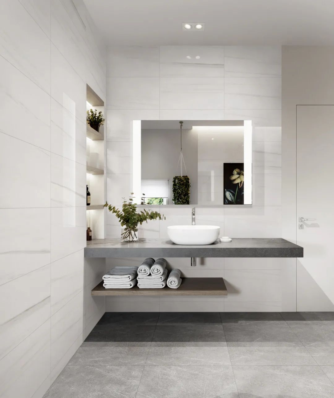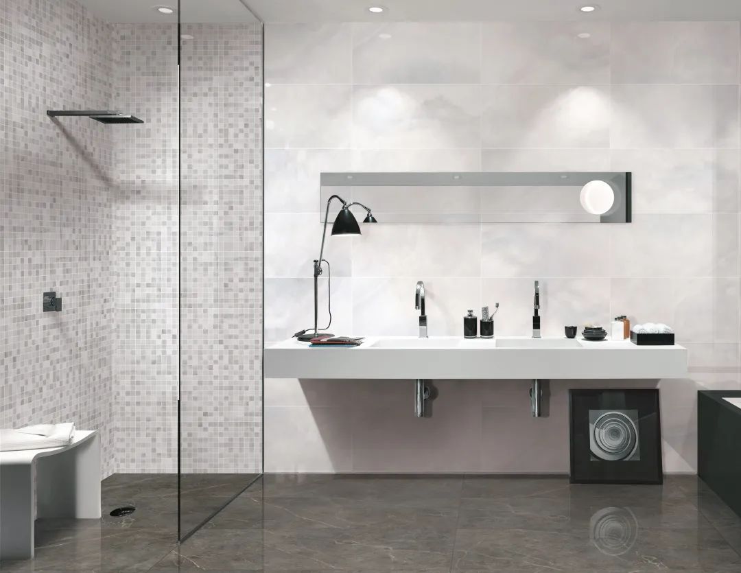 優(yōu)雅整潔的現(xiàn)代衛(wèi)生間,奶白和淺灰色紋理若隱若現(xiàn),宛如銀河劃過星空般迷人。