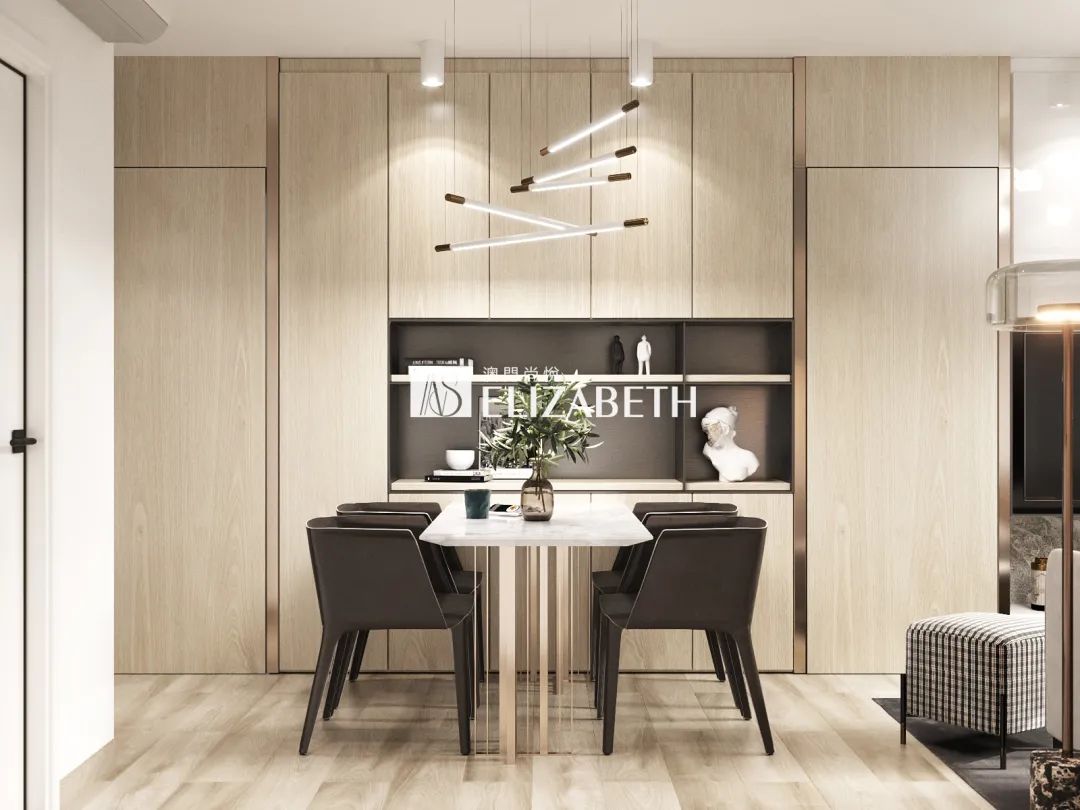 現(xiàn)代個(gè)性燈飾,為空間增添幾分美感;大理石餐桌和靠背餐椅,彰顯現(xiàn)代簡(jiǎn)約生活的品質(zhì)感;優(yōu)雅情趣的花瓶布置,讓用餐空間更顯精致。