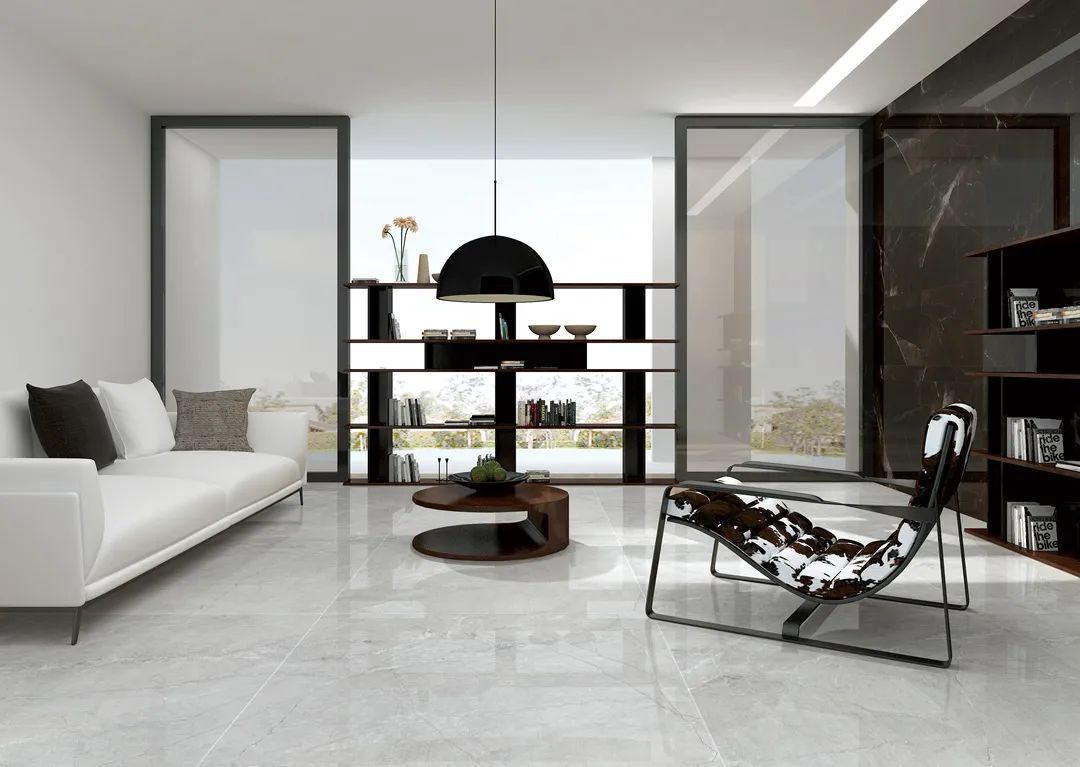黑色現(xiàn)代書架,白色軟皮沙發(fā),