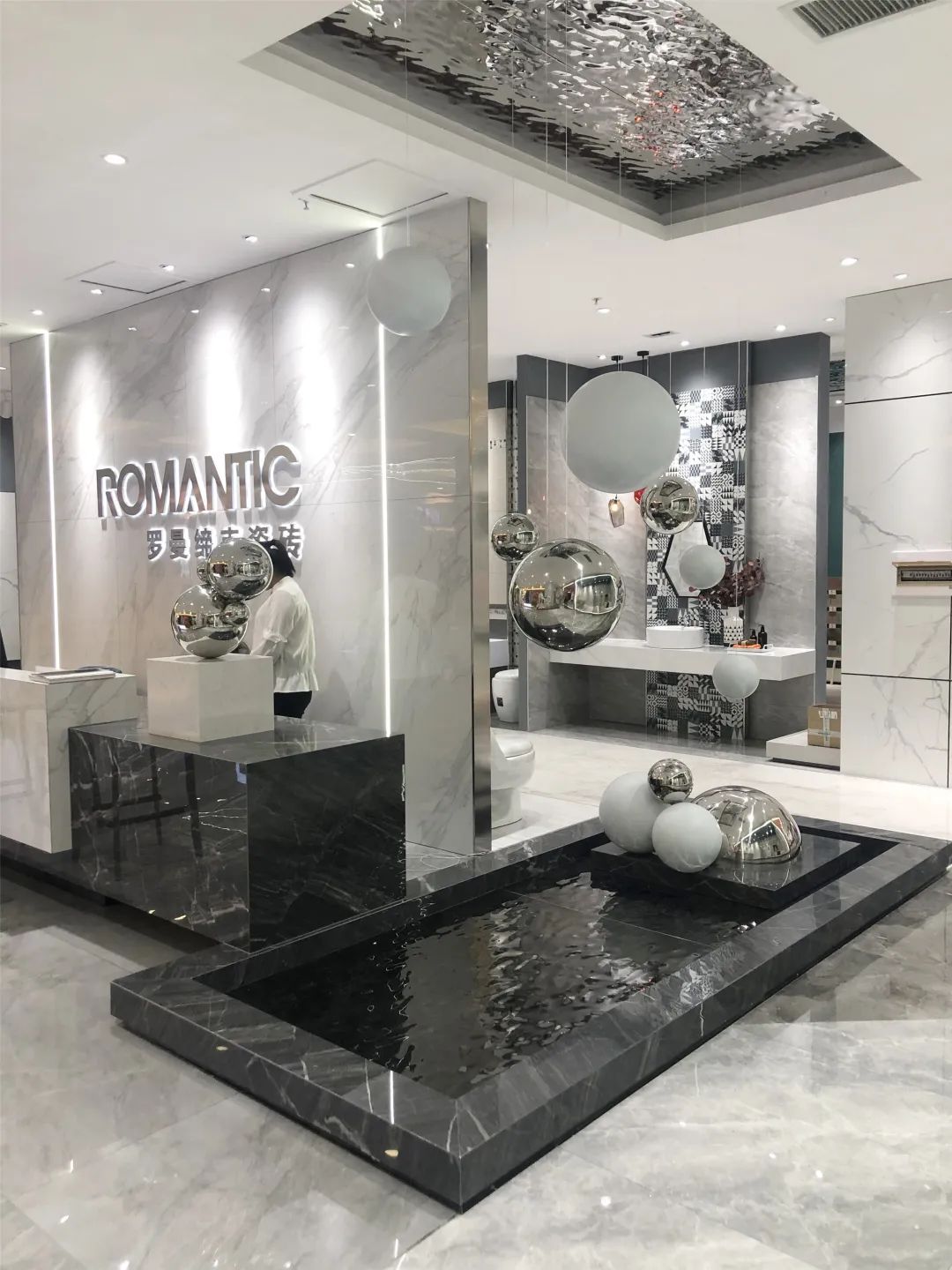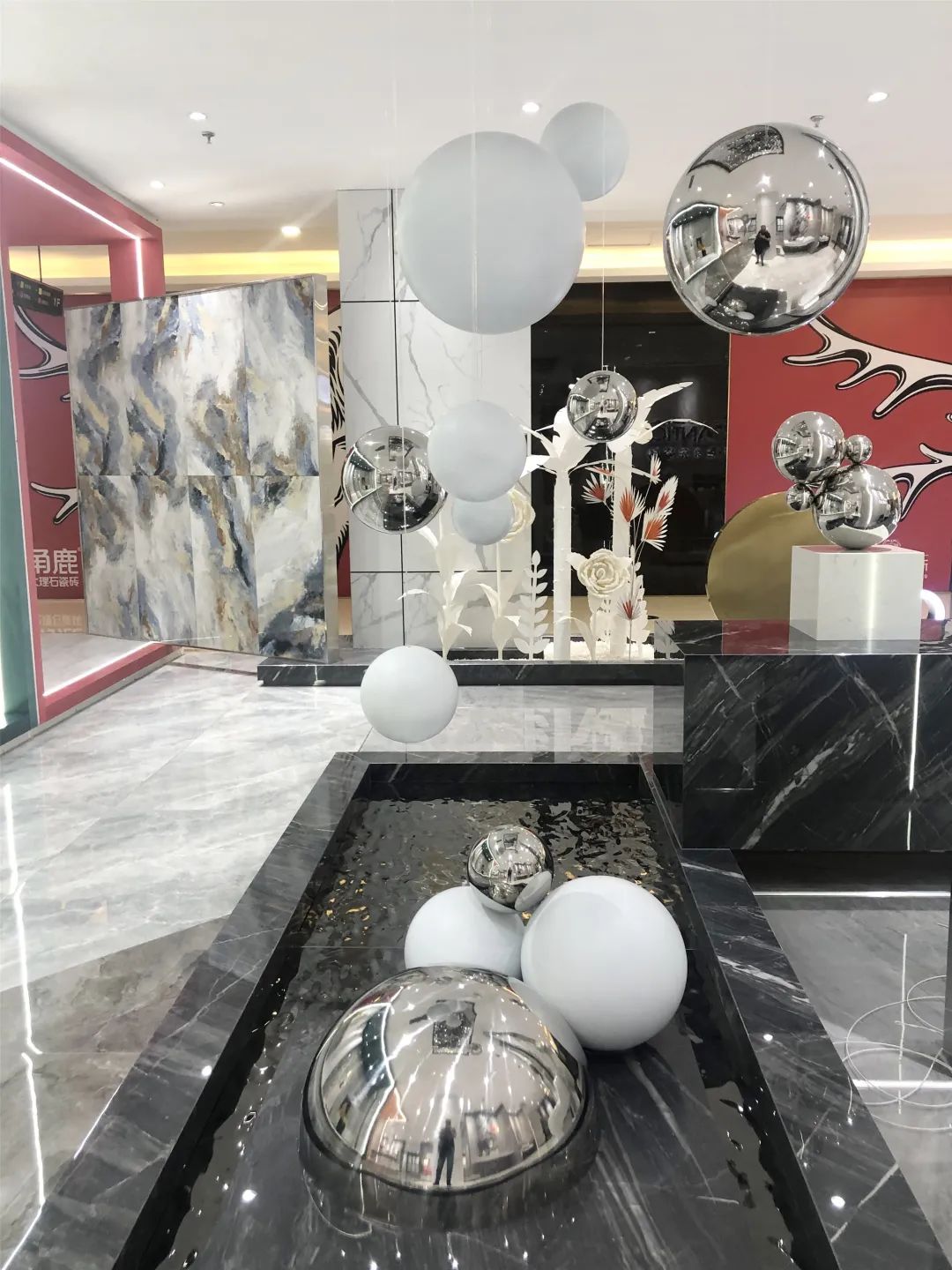 矩形的前廳向四面敞開,空間也隨著步伐的深入豁然開朗。位于轉(zhuǎn)角一隅的一池水景,池中放置的明鏡般不銹鋼球體和如月亮般美好的球體或明亮或啞光,與懸置銀箔吊頂、球體的藝術(shù)裝置呼應(yīng),滿眼流動與通透。