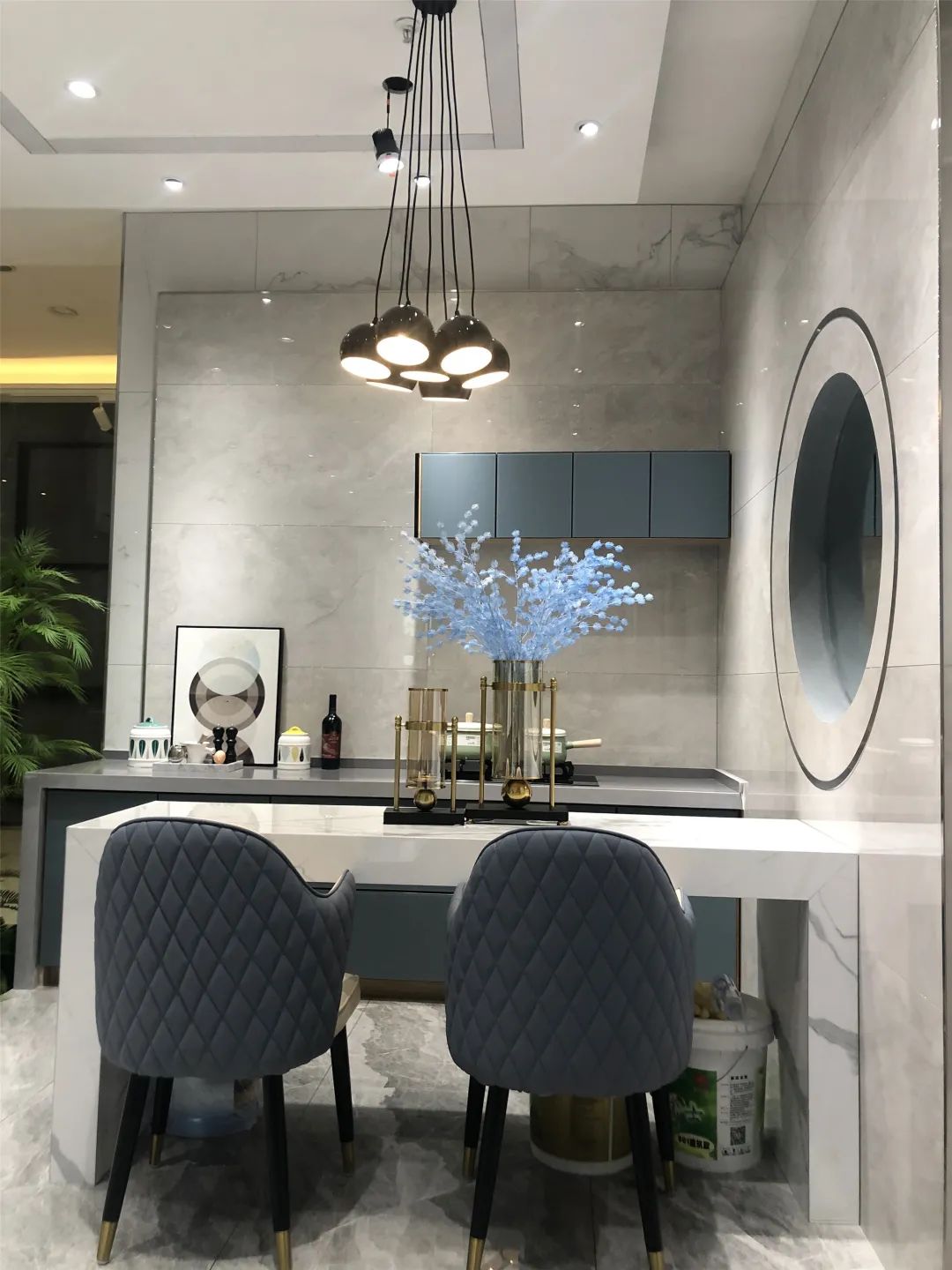 The rectangular front hall is open to all sides, and the space is suddenly clear as the pace deepens. A pool of waterscape located in the corner of the corner, the mirror-like stainless steel spheres and moon-like spheres or bright or matt are placed in the pool, echoing the art installations of suspended pools and spheres, flowing and transparent.