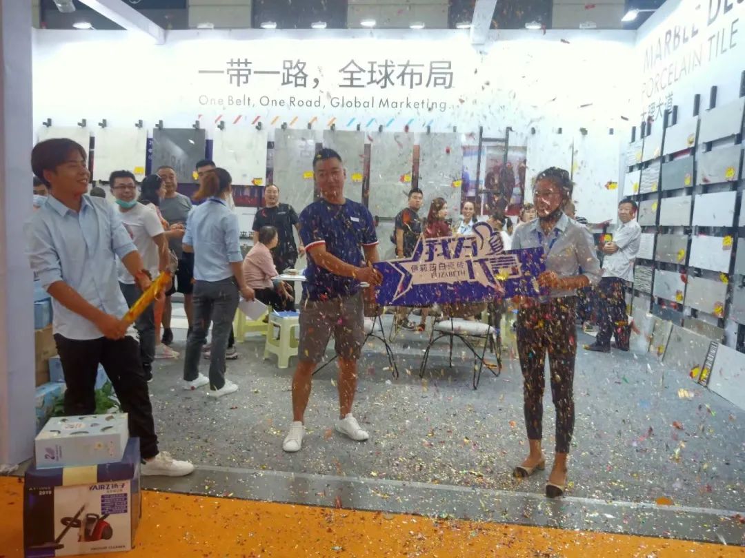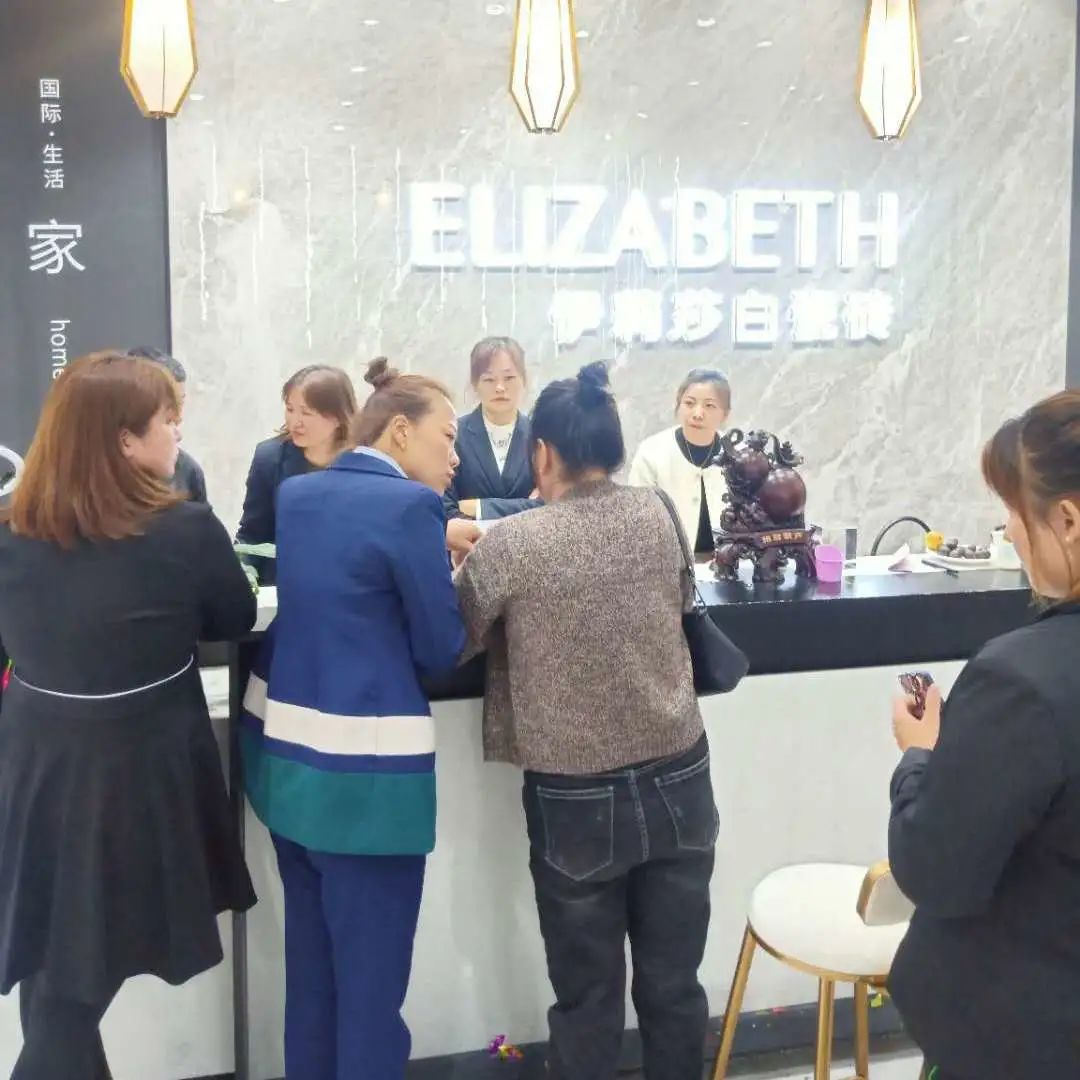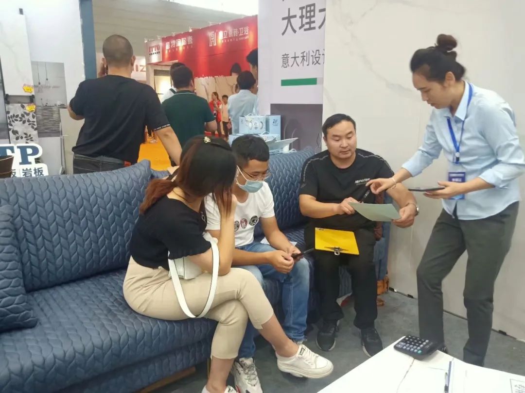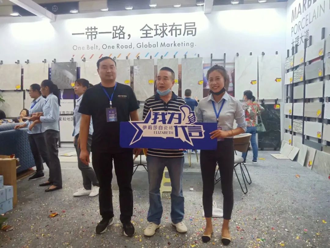 On the day of the show, Eliza's white tile booth attracted a crowd of owners. Many new products, such as 900*1800mm large board with texture, 600*1200mm super white base marble tiles, 300x800 art wall tiles, etc., have attracted many consumers to come to taste and choose after the debut of the best-selling series. Some owners are more early in the store to watch, waiting for the start of the activity, they will directly come to order.