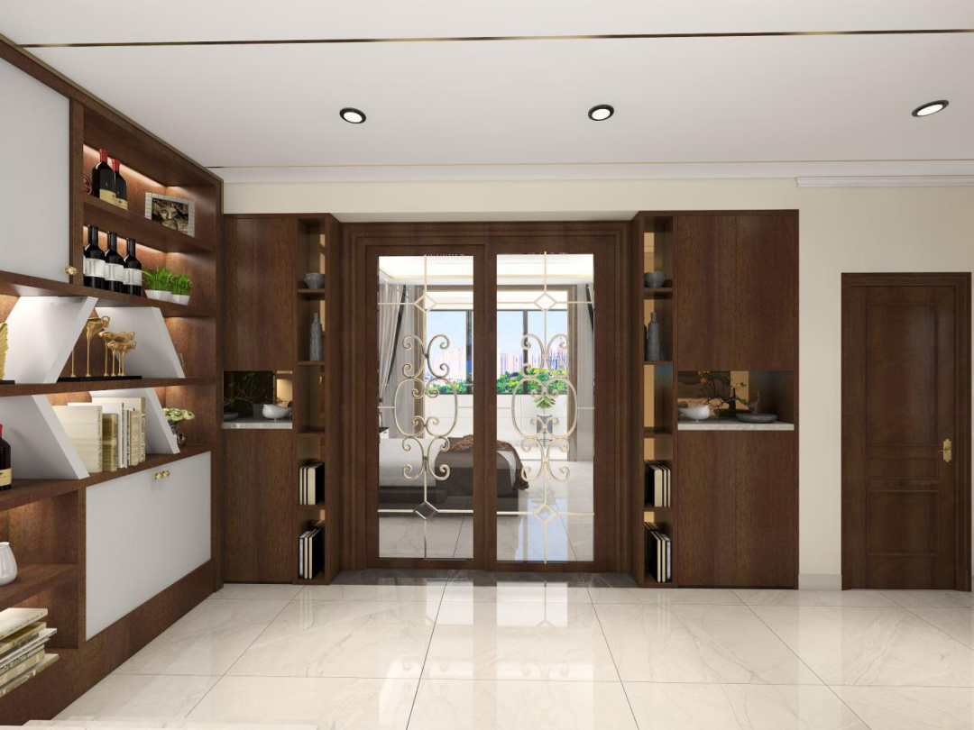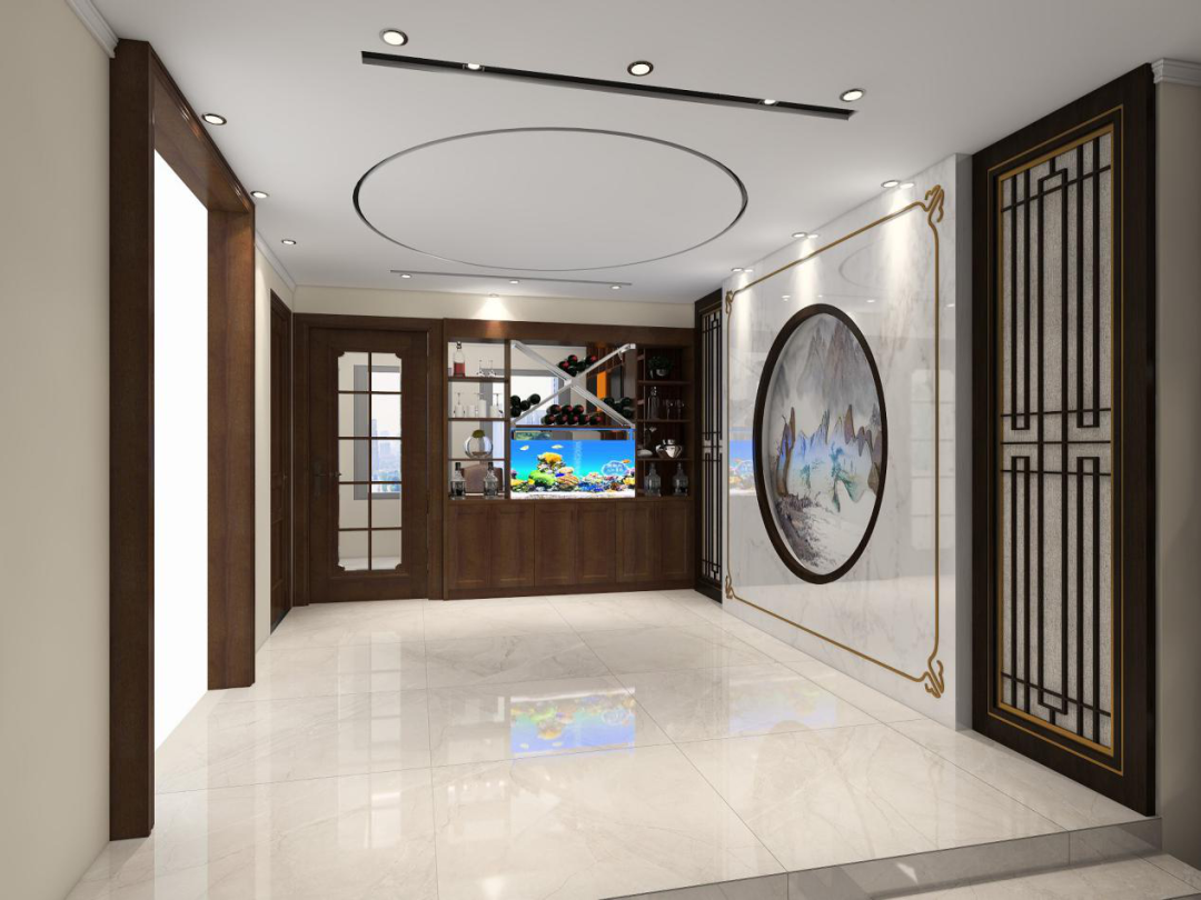 整個三樓作為休息區(qū),在“維納斯”地磚的鋪陳下溫馨而優(yōu)雅。精致的中國圓背景墻設(shè)計,詩意山水景畫,把新中式古韻禪意愈發(fā)濃郁;酒柜,書柜,置物柜,中式家具充滿客廳空間。