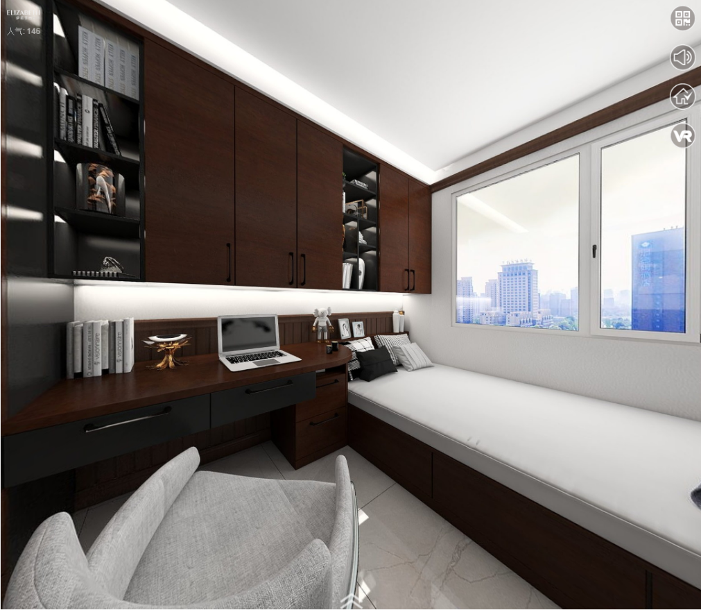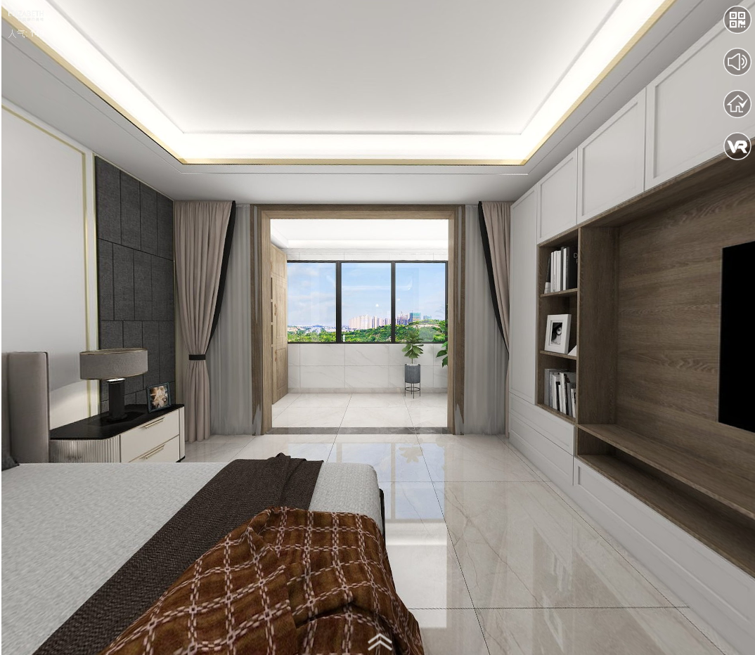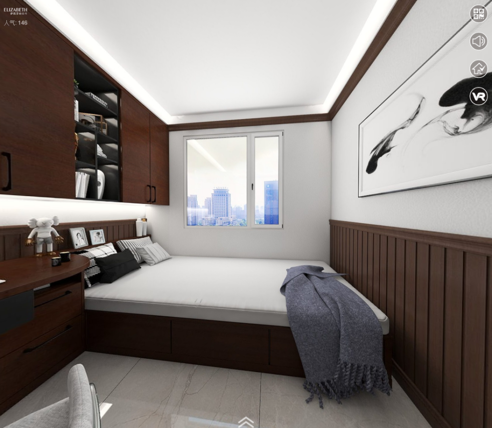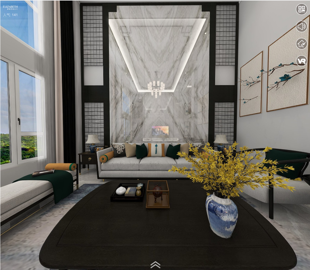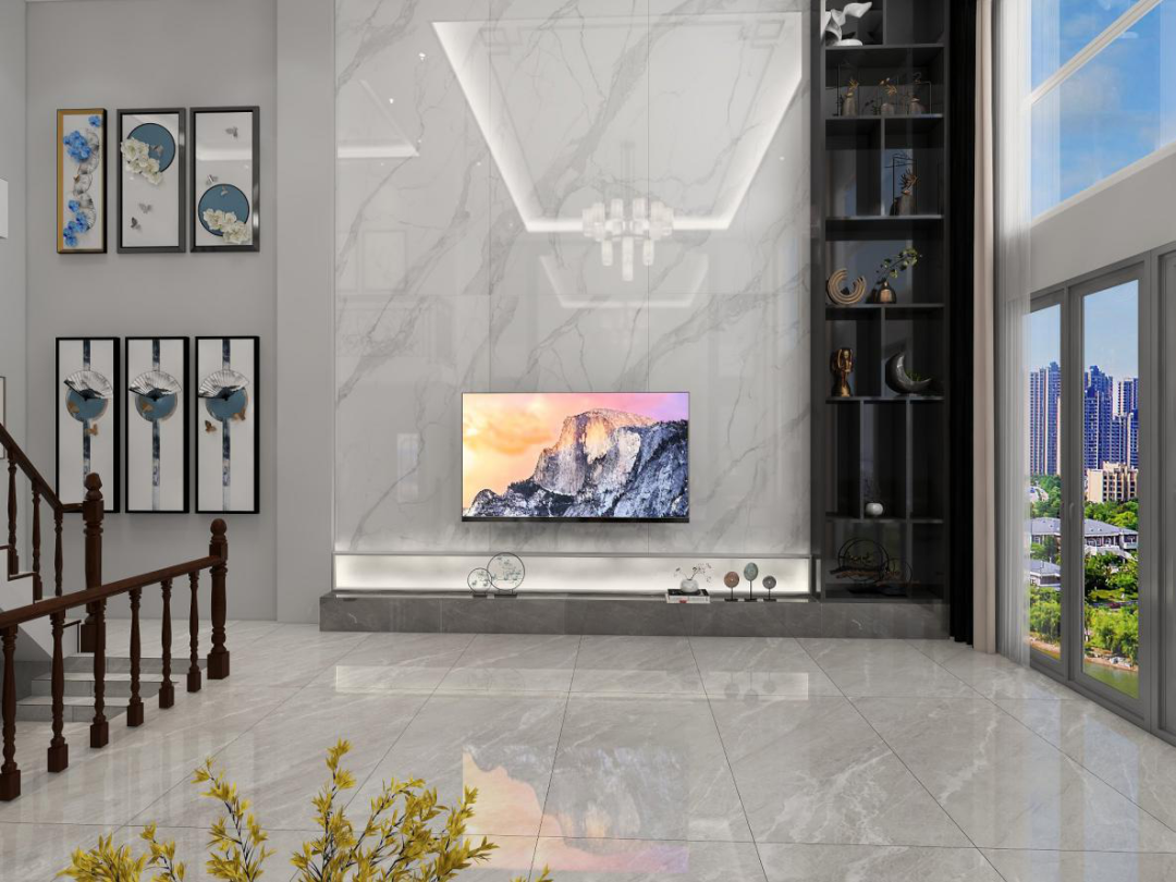 750*1500mm“卡里姆灰”大板一鍵應(yīng)用首次全空間地面,一磚8紋延伸鋪貼,盡顯高檔大氣;亮光磚面在窗外自然光的照射,帶來干凈明亮的視覺感受;電視背景墻選用超大規(guī)格1200*2400mm連紋大板“魚肚白”豎貼兩片到頂,三片大板縱橫向連紋,簡約時尚,至簡至美。