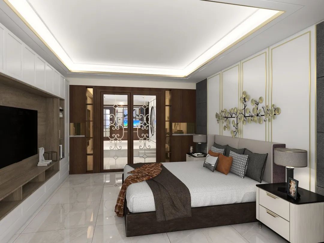 750*1500mm "Karim gray" large board is applied to the full-space floor for the first time with one key. One brick has 8 lines of extended paving, showing the high-grade atmosphere to the utmost. The light brick surface is illuminated by natural light outside the window, bringing a clean and bright visual experience. The TV background wall selects the super size 1200*2400mm even grain big board "fish belly white" to stick two pieces vertically to the top, three big boards are vertical and horizontal to even grain, simple and fashionable, to simple to the United States.