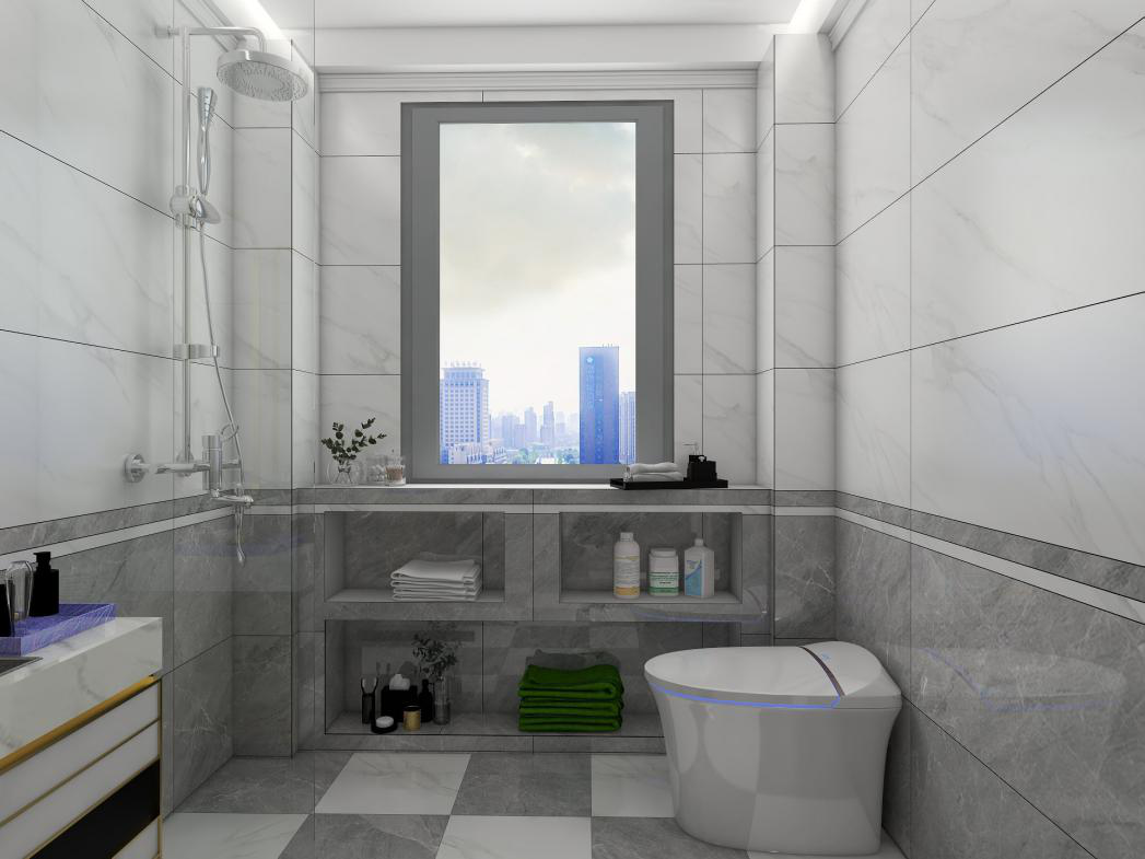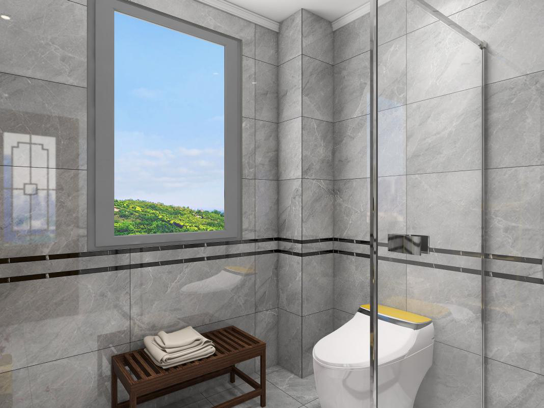 衛(wèi)生間選用了深淺兩種色調(diào)瓷磚凸顯層次感,上墻用自然清新的“卡拉拉銀”系列,白色墻磚讓空間通透產(chǎn)生擴(kuò)張感;下墻繼續(xù)沿用高級灰“倚天石”,與一樓衛(wèi)生間相呼應(yīng),延伸兩邊柱子直接連起來做個壁龕,戶主對此十分滿意。