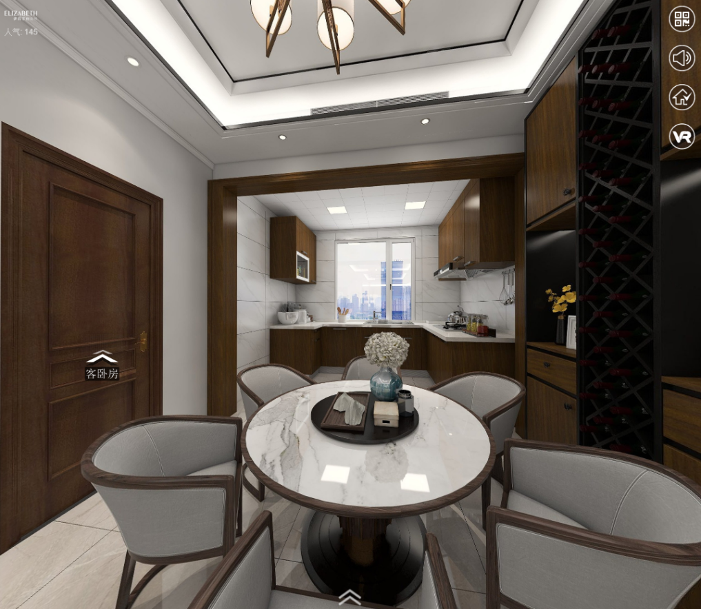 地面選用暖灰系“維納斯”系列搭配。“維納斯”灰色調(diào)里融入了淡雅的暖黃渲染,從觀感上就能帶來溫暖浪漫的就餐氛圍;廚房既可以增設(shè)一個可推拉的玻璃門,形成一個半開放式的烹飪空間,既能隔絕油煙也能更好地互動,增加采光。