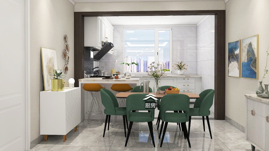 采用吧臺隔斷打造半開放式廚房,延伸出來的吧臺充當(dāng)臨時取餐區(qū),方便實(shí)用。