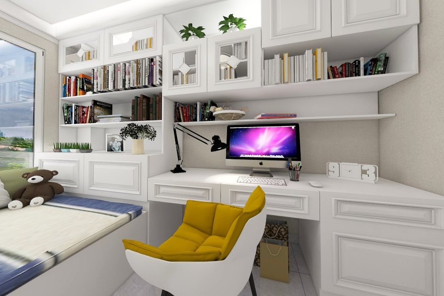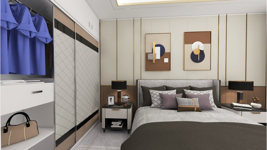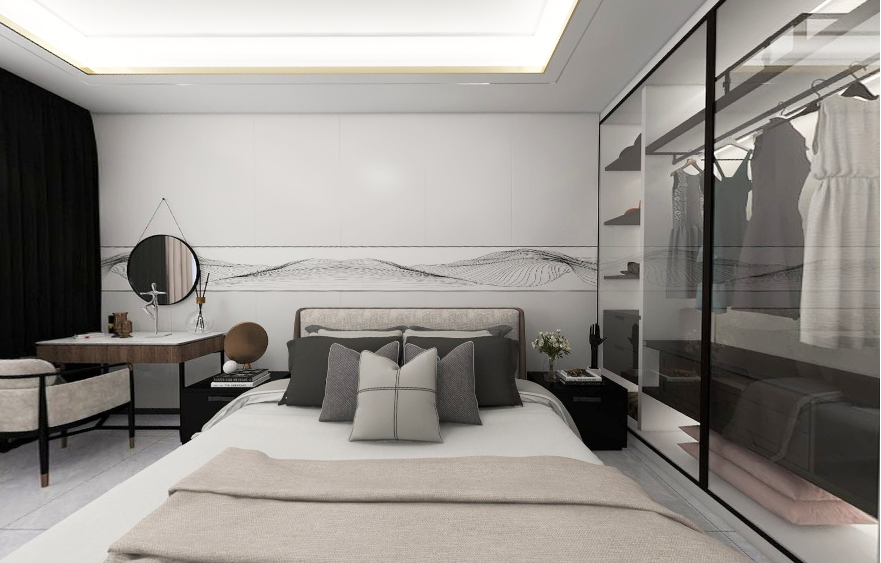 透明玻璃衣櫥精致大氣,所有衣服都明朗地呈現(xiàn)眼前,減少盲目翻找的不便;另一個半開放式的衣柜則可以放置不常用的棉被等物品,兩種設(shè)計各取所長,這樣一來讓臥室顯得十分整潔干練。
