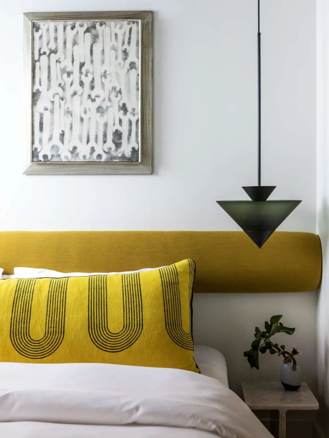 A bright yellow is settled in the space of extreme gray. Although it is only an ornament of small area, it is eye-catching enough to attract eyes, so that the whole quiet space has vitality. The natural fusion of warm and cold colors presents a modern and fashionable household space.