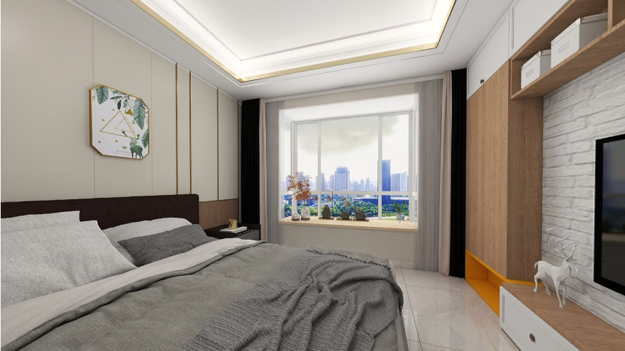 Venus's warm gray tone makes the space look bright and warm. The wood customized wall cabinet decoration is similar in tone to the floor tile, which ensures the consistency of the overall color. In order to make the whole space look more spacious and practical, the designer removed the sliding door of the sightseeing balcony, and the large French window ensured sufficient light, with great lighting and natural scenery.