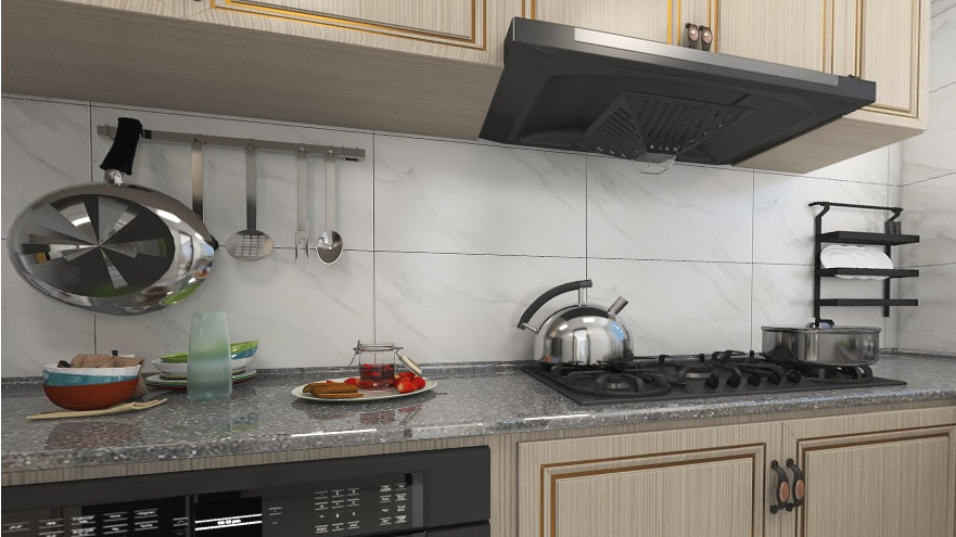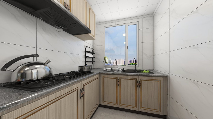Unique I-shaped kitchen, high space utilization, simple layout, convenient for daily cooking and walking; 400*800mm light wall brick "Carrara", especially suitable for kitchen lampblack space, anti-fouling and easy to clean.