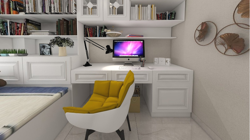 生活陽(yáng)臺(tái)與餐廳,客臥陽(yáng)臺(tái)與生活陽(yáng)臺(tái)相互打通,擺置了個(gè)儲(chǔ)物柜,兼具裝飾性和收納功能,同時(shí)也多了一個(gè)半開(kāi)放式的書房使用。