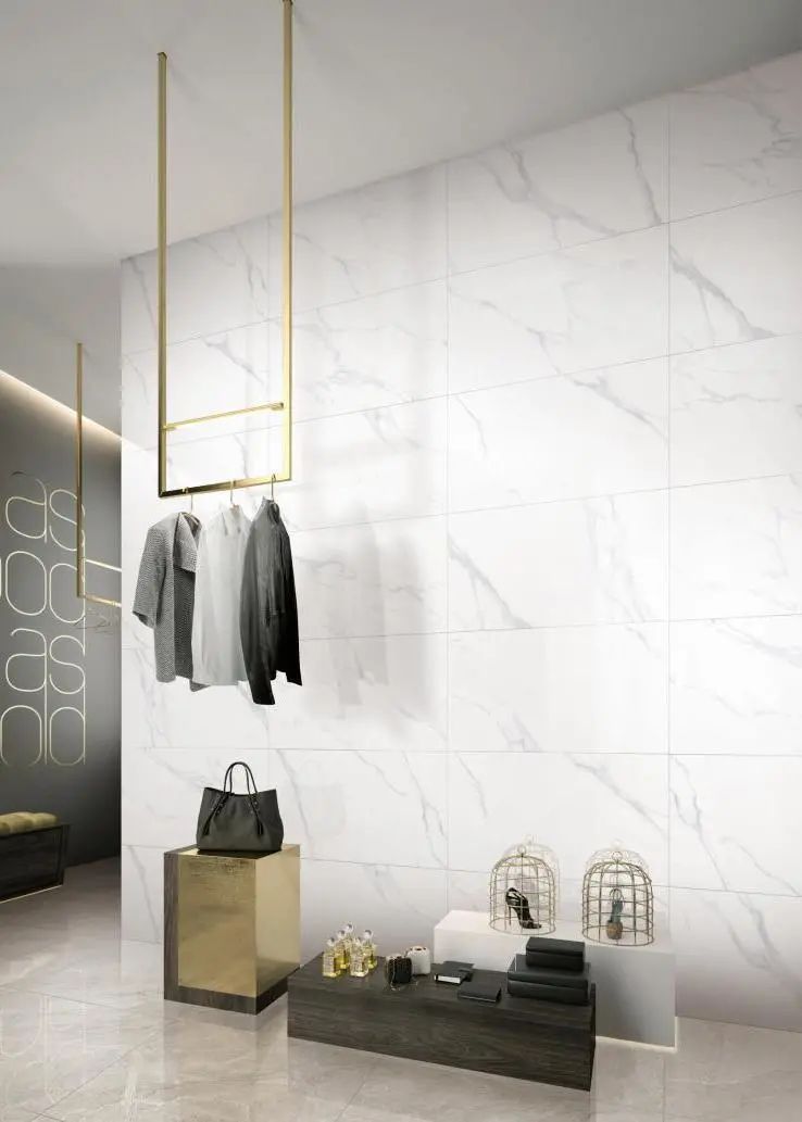 White "Carrara" decorative wall, create a neat and clean shopping environment; Brand clothing for sale hanging display, in the white wall against the backdrop, especially eye-catching, can achieve the effect of quickly attracting the line of sight of the door customers.