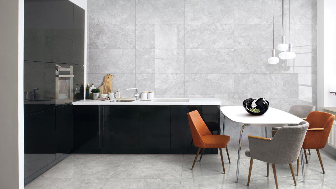 Two different shades of grey, "Qatar" for the wall, and "Siya Grey" for the whole marble tile floor, low-key but full of layers; Hermes orange dining chair makes the whole kitchen space will not appear too deserted, also more taste.