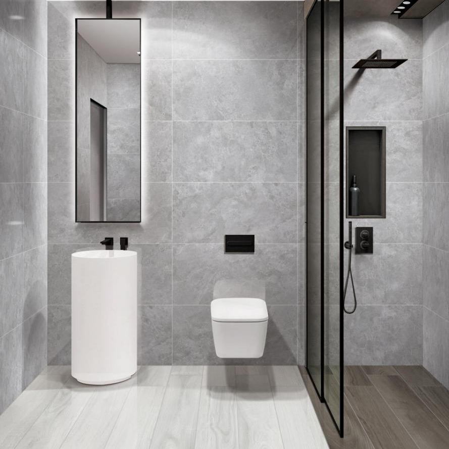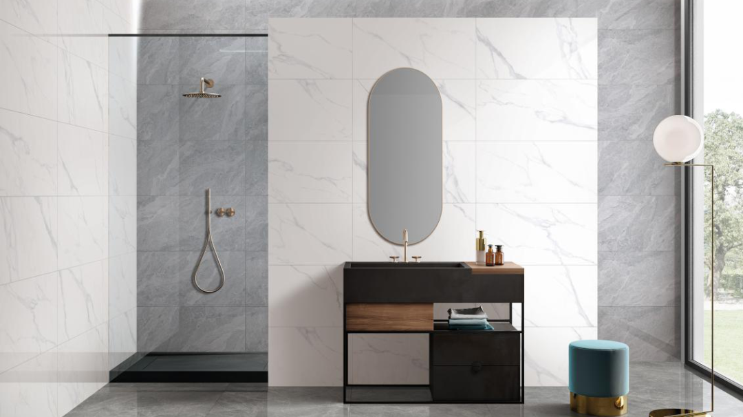 “德魯納”的大面積應用,強調(diào)空間的靜謐性,加入木紋磚搭配,提升空間溫度。