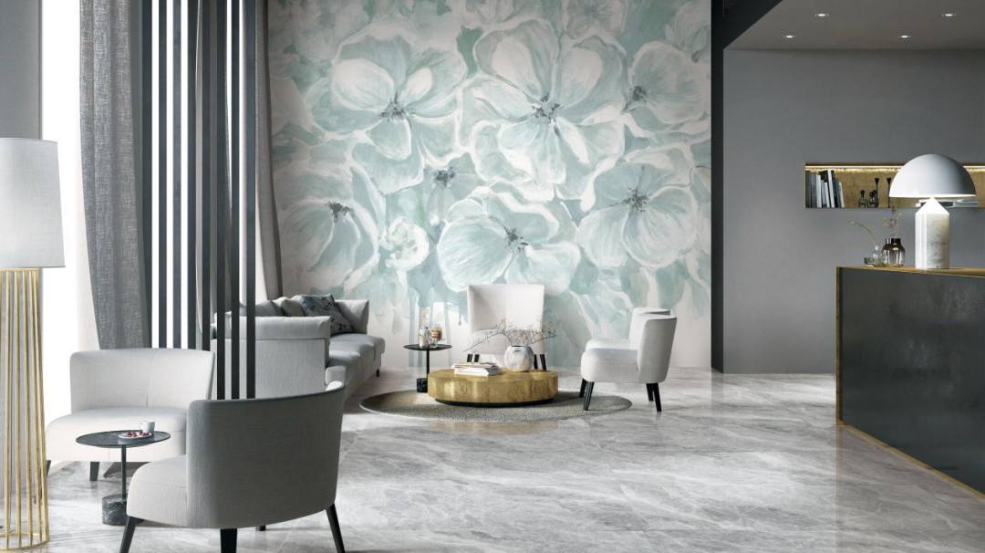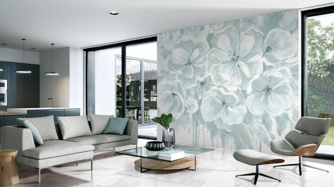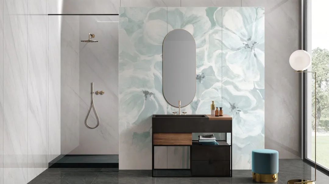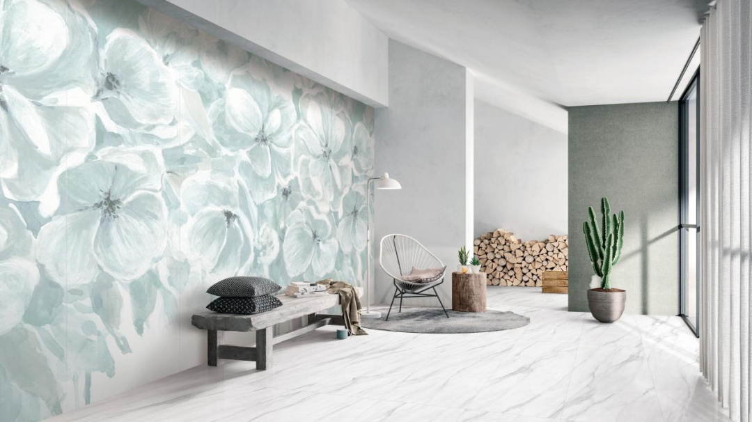 “岸芷汀蘭”與白色系地磚搭配,甚是清新,絢麗綻放的蘭花圖案美若如畫,裝飾于極簡風(fēng)墻面,即成一道獨立風(fēng)景線。