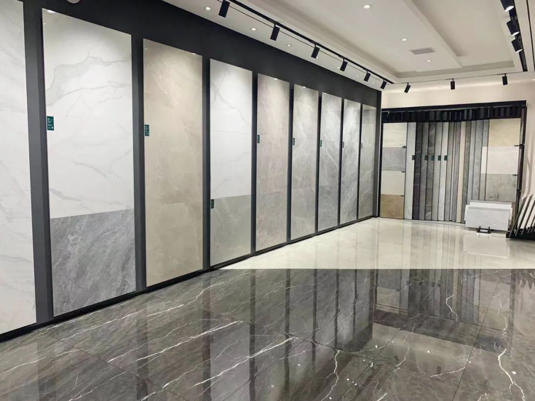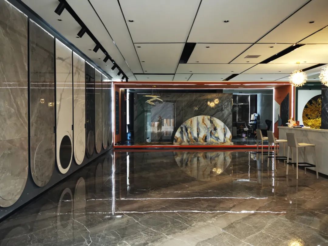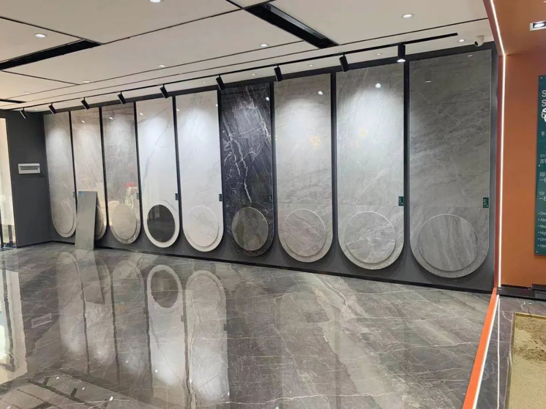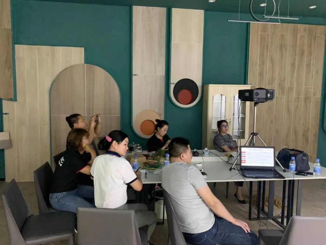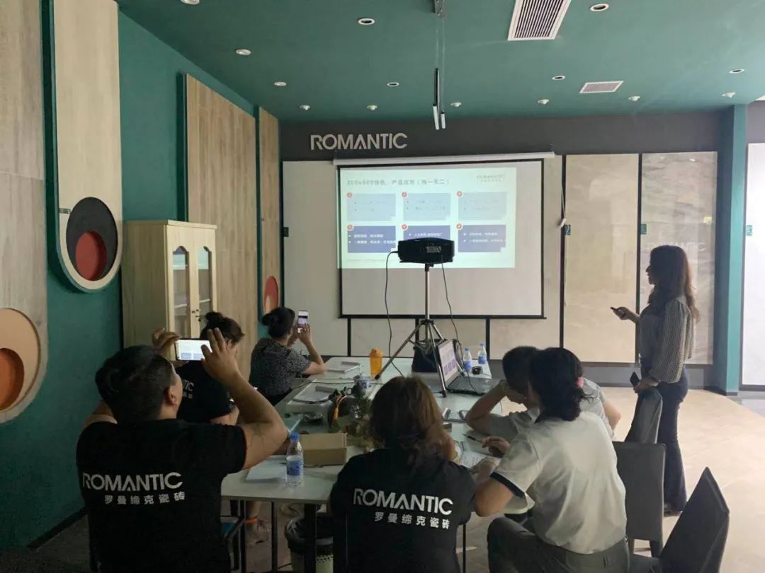 井然有序的大理石瓷磚選材區(qū),勾畫出一道石材風(fēng)景。The marble tile selection area delineates a stone landscape.羅曼締克大理石瓷磚系列注重紋理觸感、視覺效果到空間應(yīng)用的體驗(yàn)美感。來到樓梯中庭處,曲線優(yōu)雅的吊燈為店內(nèi)空間帶來了流動(dòng)感和藝術(shù)感,同時(shí)指引著賓客拾階而上,在樓梯轉(zhuǎn)彎處給你一份驚喜。如果你想給廚房、浴室、陽臺(tái)或玄關(guān)處,尋覓獨(dú)特的設(shè)計(jì)靈感,那么二樓是你的最佳選擇。二樓展示著300x600mm、300x800mm、360x900mm瓷質(zhì)模具磚,豐富的花色與質(zhì)感,靜待著你的欣賞。ROMANTIC西雙版納店面設(shè)計(jì)已經(jīng)進(jìn)入最后的優(yōu)化期間,靜待它的完美呈現(xiàn),到時(shí)小曼將用美好的店面照片解讀ROMANTIC西雙版納的故事。3月16-17日,陳總邀請(qǐng)了羅曼締克品牌總部市場部經(jīng)理郭彩宏到店為團(tuán)隊(duì)進(jìn)行一場技能提升。郭彩宏在產(chǎn)品賣點(diǎn)和品牌優(yōu)勢、文化上多維度講解,讓ROMANTIC西雙版納團(tuán)隊(duì)收獲滿滿干貨。