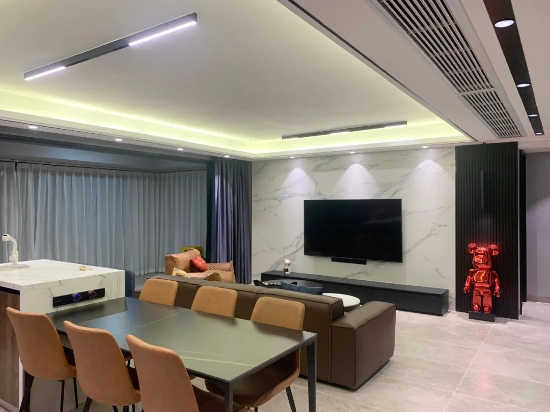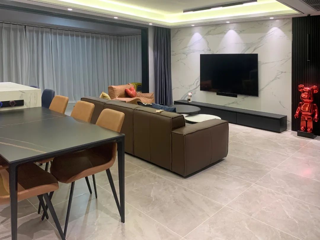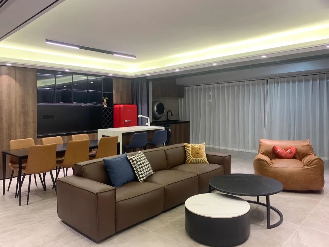 細(xì)節(jié)里藏著生活的情調(diào)。打通陽(yáng)臺(tái)與客廳阻隔,以大大的落地窗引入自然光線,整個(gè)空間變得輕盈而通透,給主人家留下更多的活動(dòng)空間。愛心形的、格紋的、卡通獅子頭的抱枕,電視背景墻一角的純色電鍍星際熊擺件,給人舒適、溫情的居家環(huán)境。