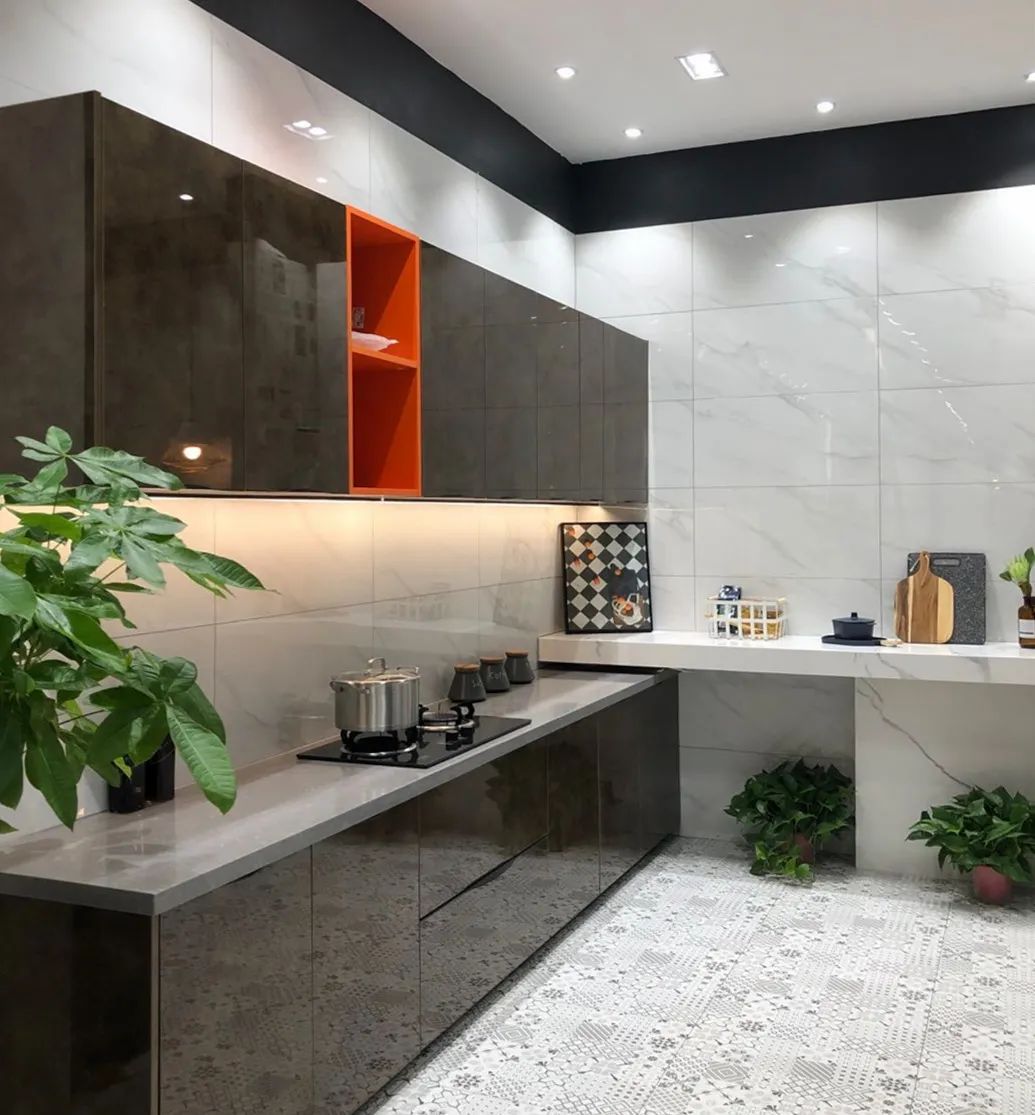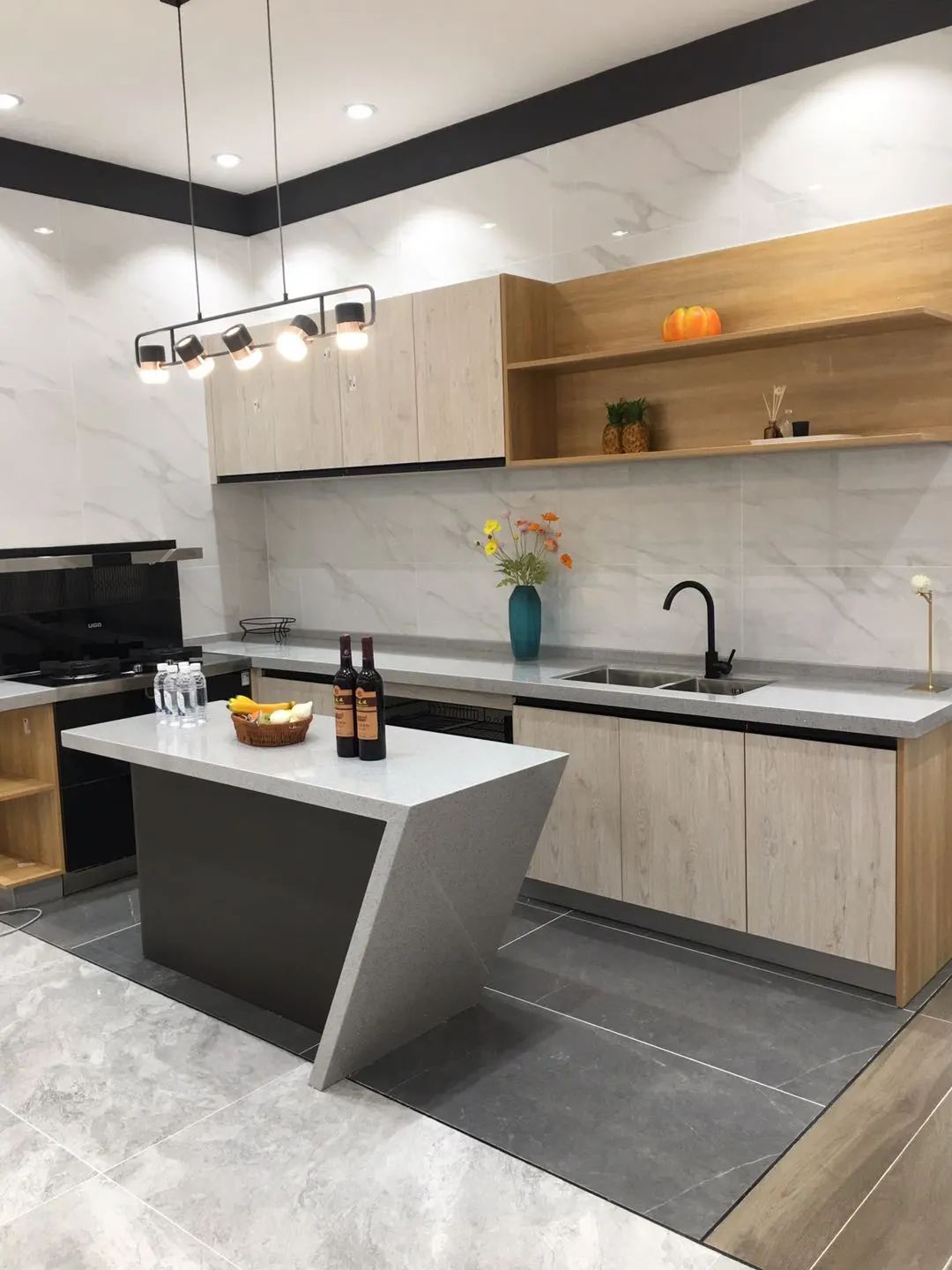 The modern open kitchen made of 400x800mm and 300x800mm bright wall tiles, beautiful and simple style, cooking in such a kitchen, cooking has become a pleasure from then on.