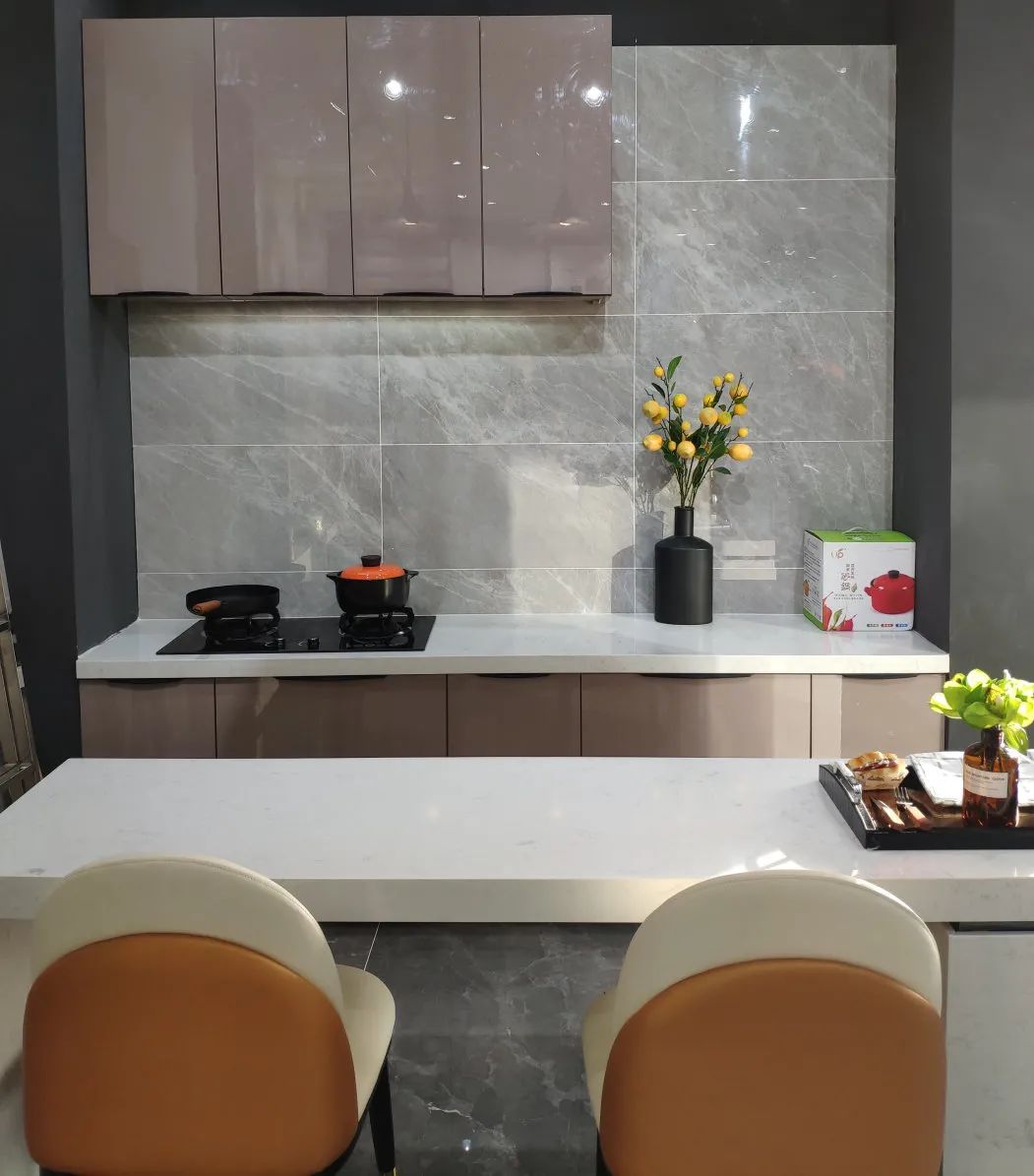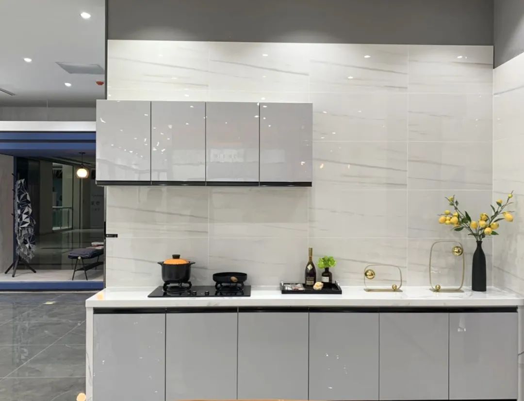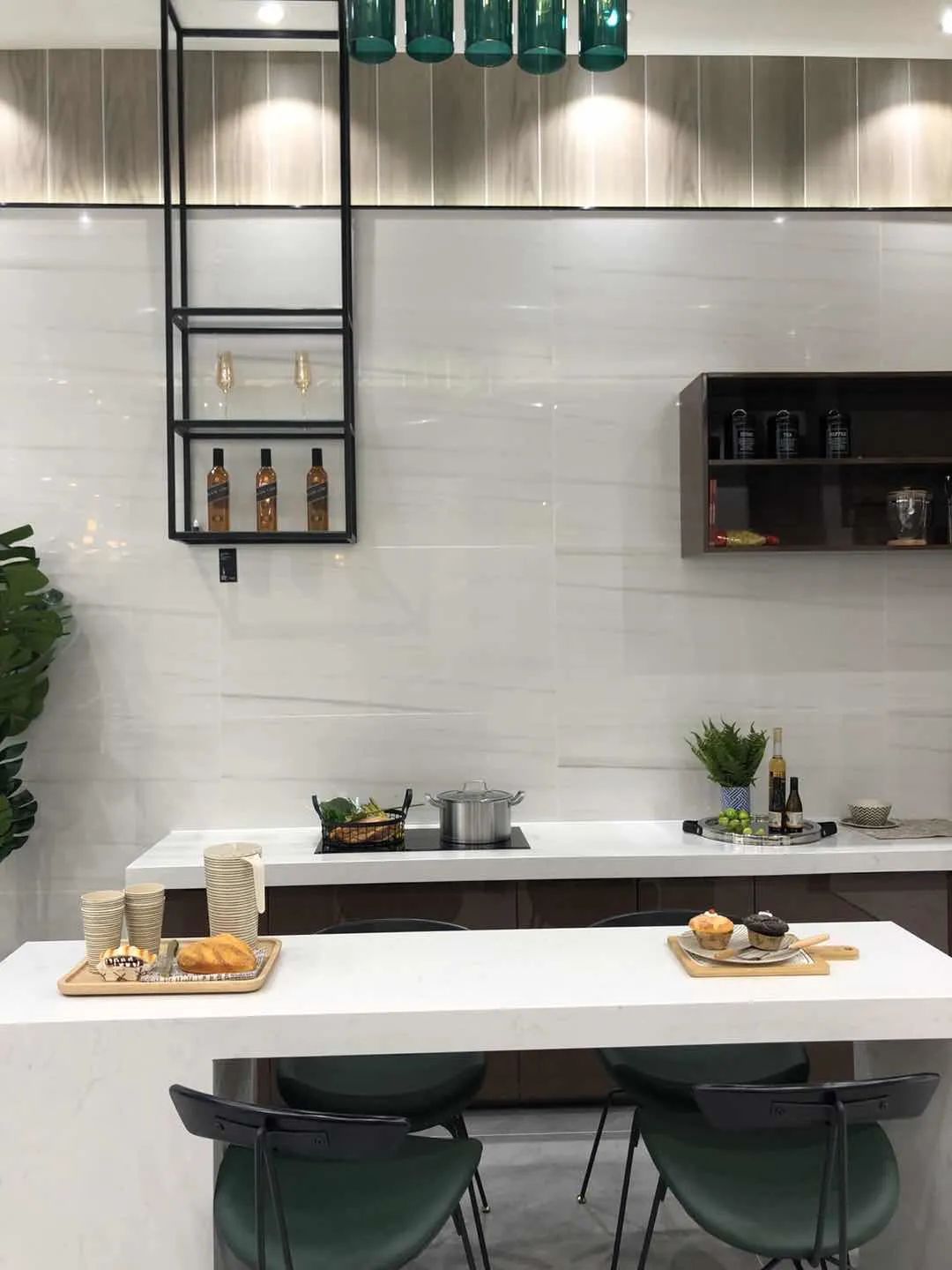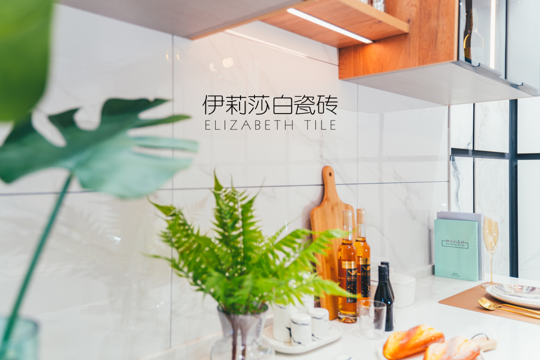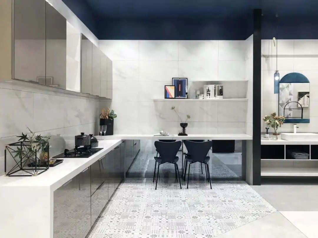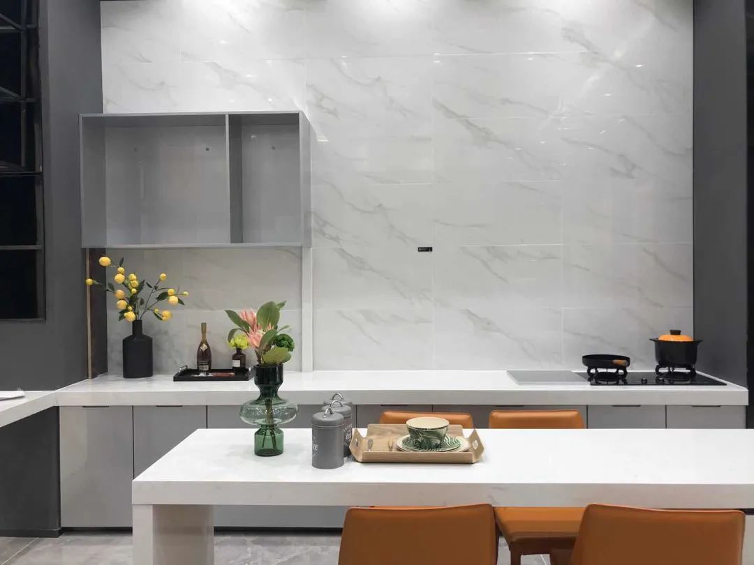 400*800 bright wall tiles "Star White" decorate the kitchen wall, matched with matte "Arctic Blue" marble floor tiles, clean and fresh, with a few bouquets of floral art, making life more refined.