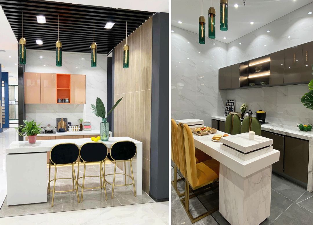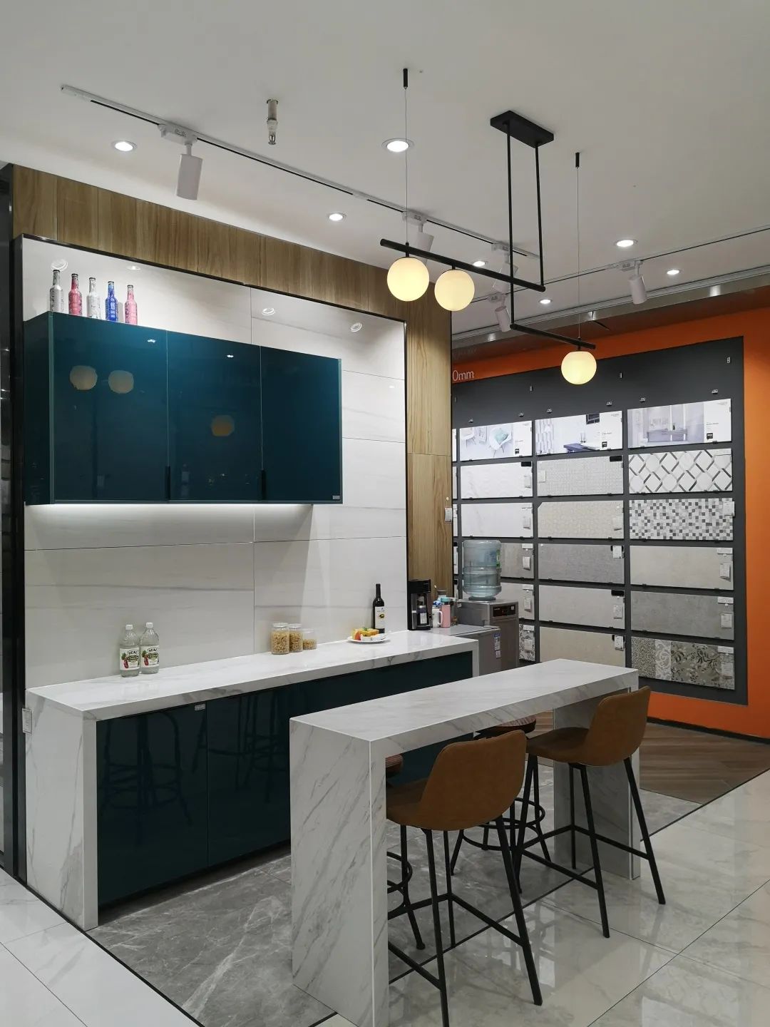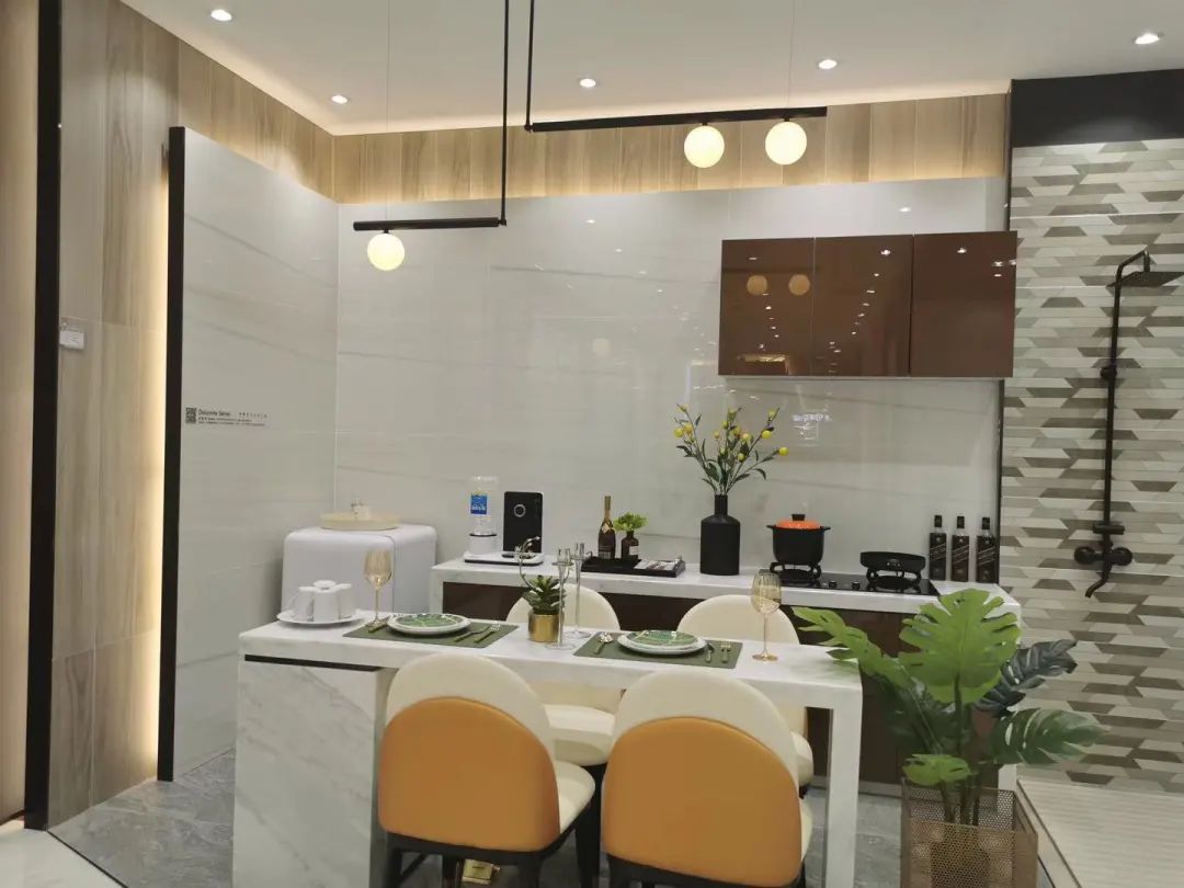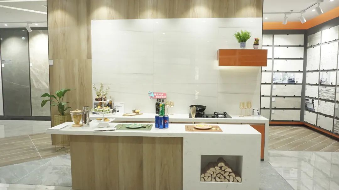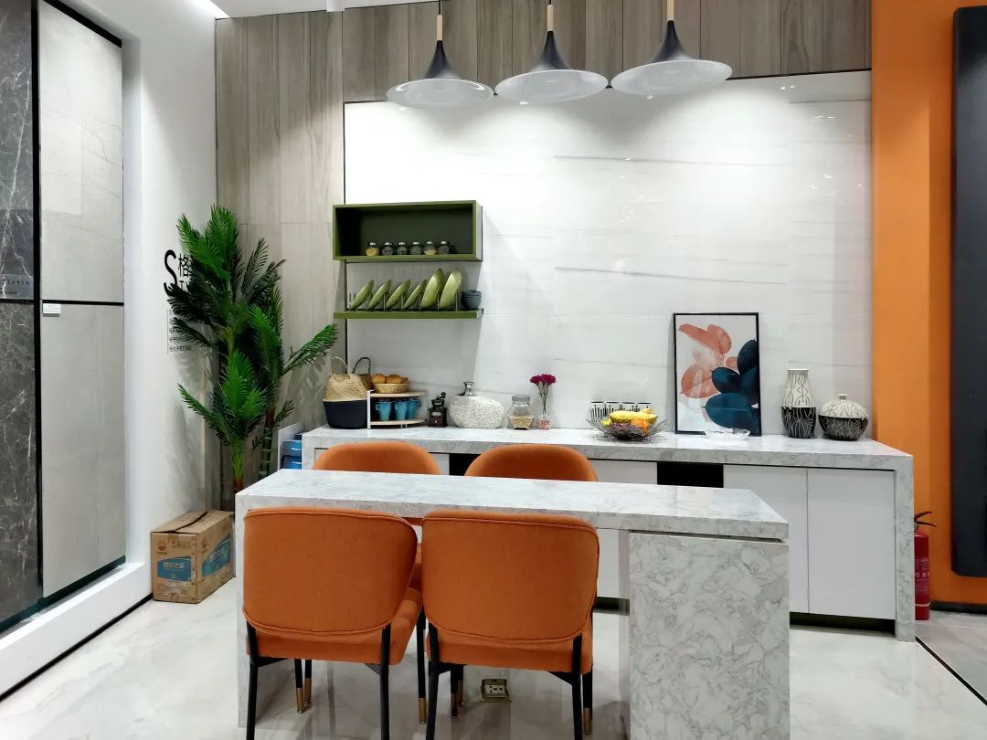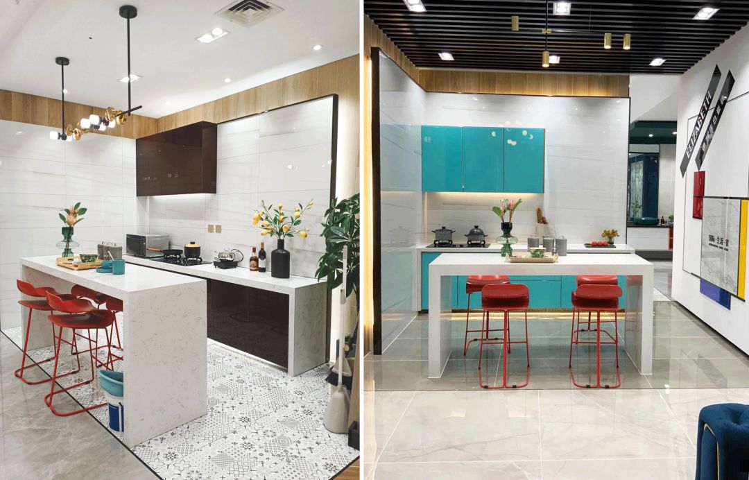 400*800 bright wall tiles "Star White" decorate the kitchen wall, matched with matte "Arctic Blue" marble floor tiles, clean and fresh, with a few bouquets of floral art, making life more refined.