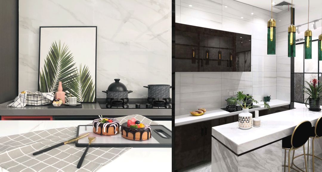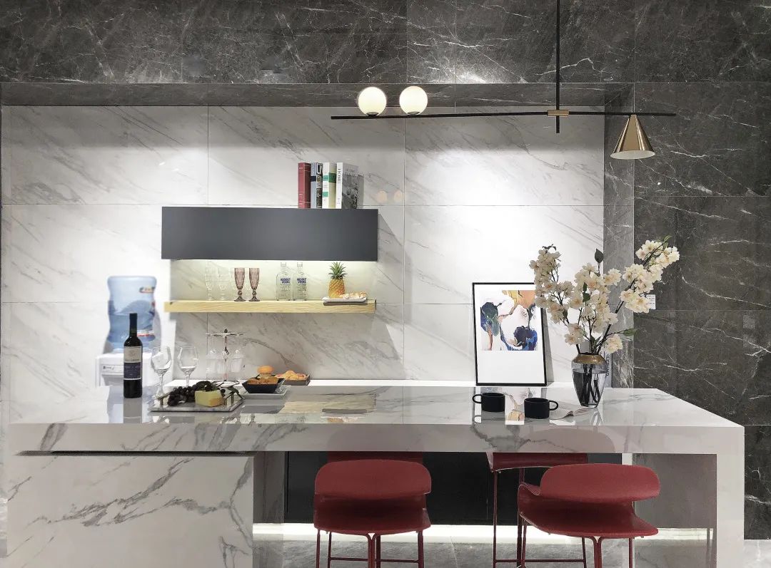 400*800亮光墻磚“星白”裝飾廚房墻面,搭配啞光“北極藍”大理石地磚,干凈清新,擺上幾束花藝,讓生活越發(fā)精致。