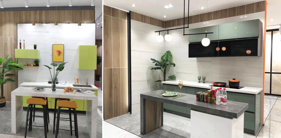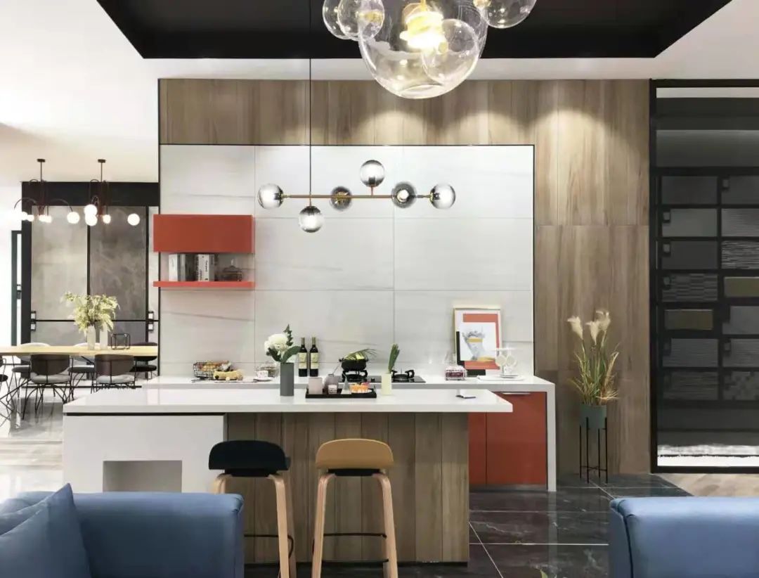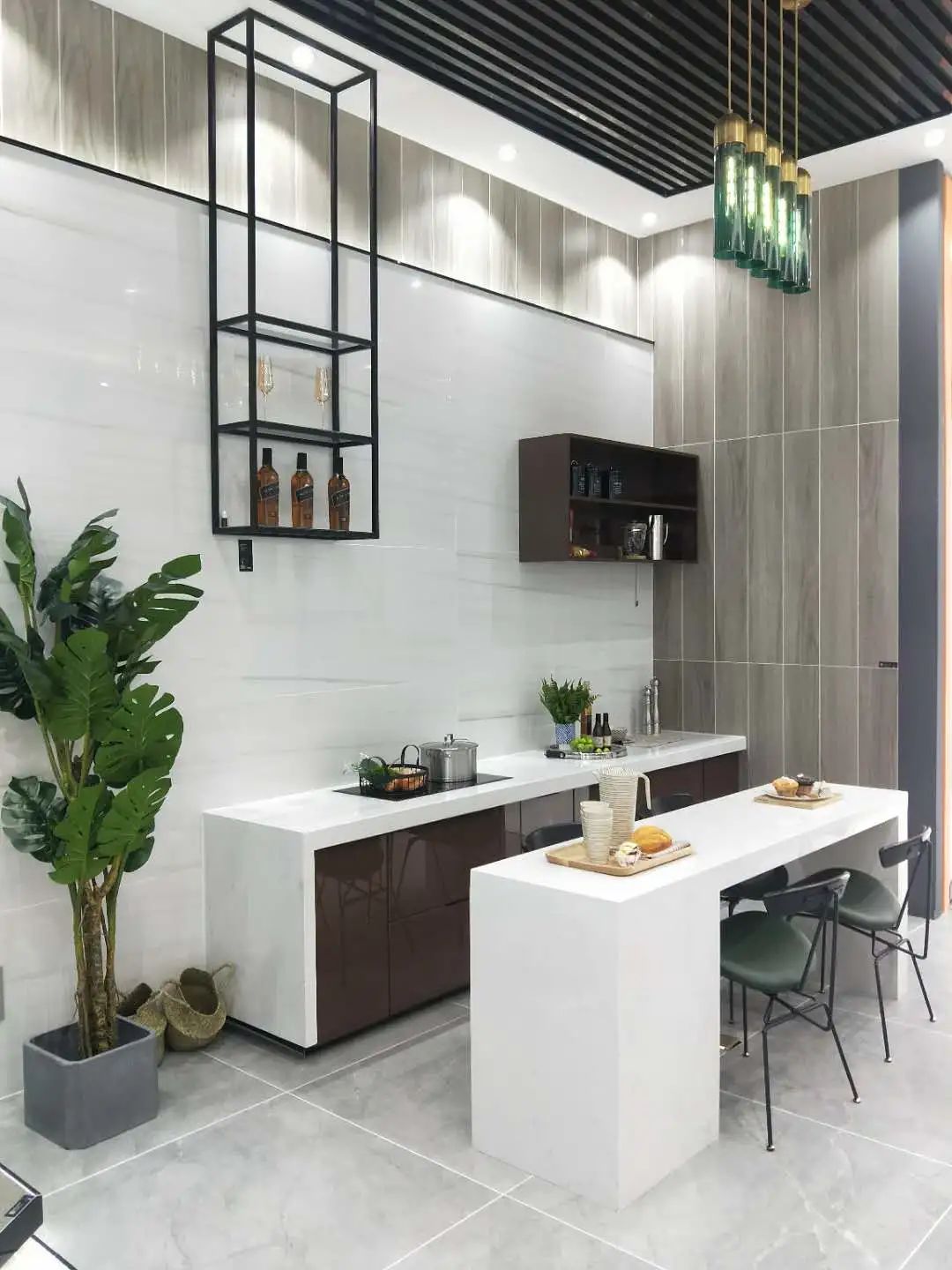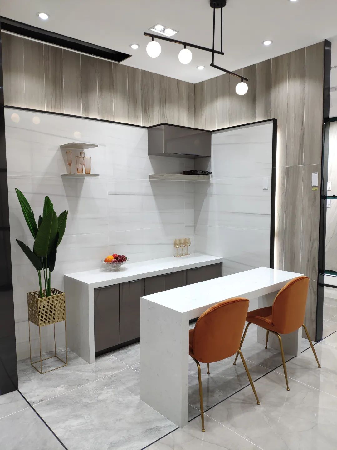 400x800mm、300x800mm亮光墻磚打造的現(xiàn)代開放式廚房,美美的簡約風(fēng),在這樣一個廚房烹飪佳肴,從此做飯也成了一種樂趣。
