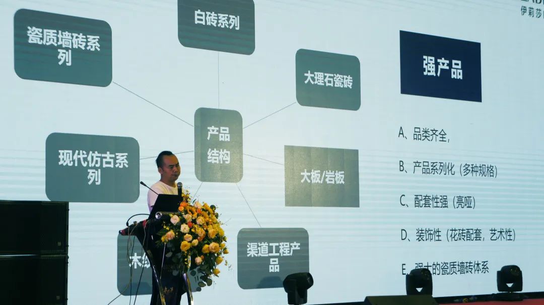 伊莉莎白瓷磚產(chǎn)品部陳平經(jīng)理現(xiàn)場(chǎng)為大家講解了整個(gè)產(chǎn)品結(jié)構(gòu)的組合,并呈現(xiàn)了近期即將推出上市的新系列產(chǎn)品。