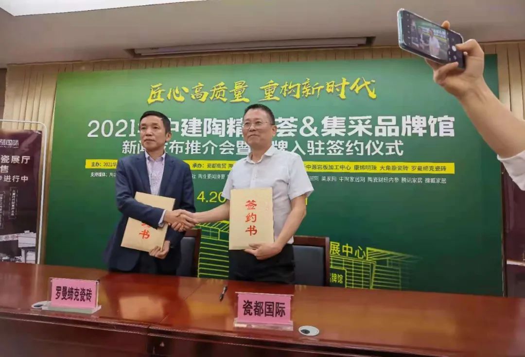 4月20日,由江西高安瓷都國際主辦的主題為《匠心高質量 重構新時代》2021華中建陶精品薈&集采品牌館招商新聞發(fā)布推介會(佛山站)圓滿舉行。羅曼締克董事長劉勝紅(左)、瓷都國際總經理何舜(右)在20家行業(yè)與家居主流媒體鎂光燈聚焦下,羅曼締克瓷磚董事長劉勝紅與五大優(yōu)秀品牌企業(yè)領導受邀出席,現(xiàn)場簽訂協(xié)議,探討行業(yè)趨勢,謀劃未來。Discuss industry trends and plan for the future.