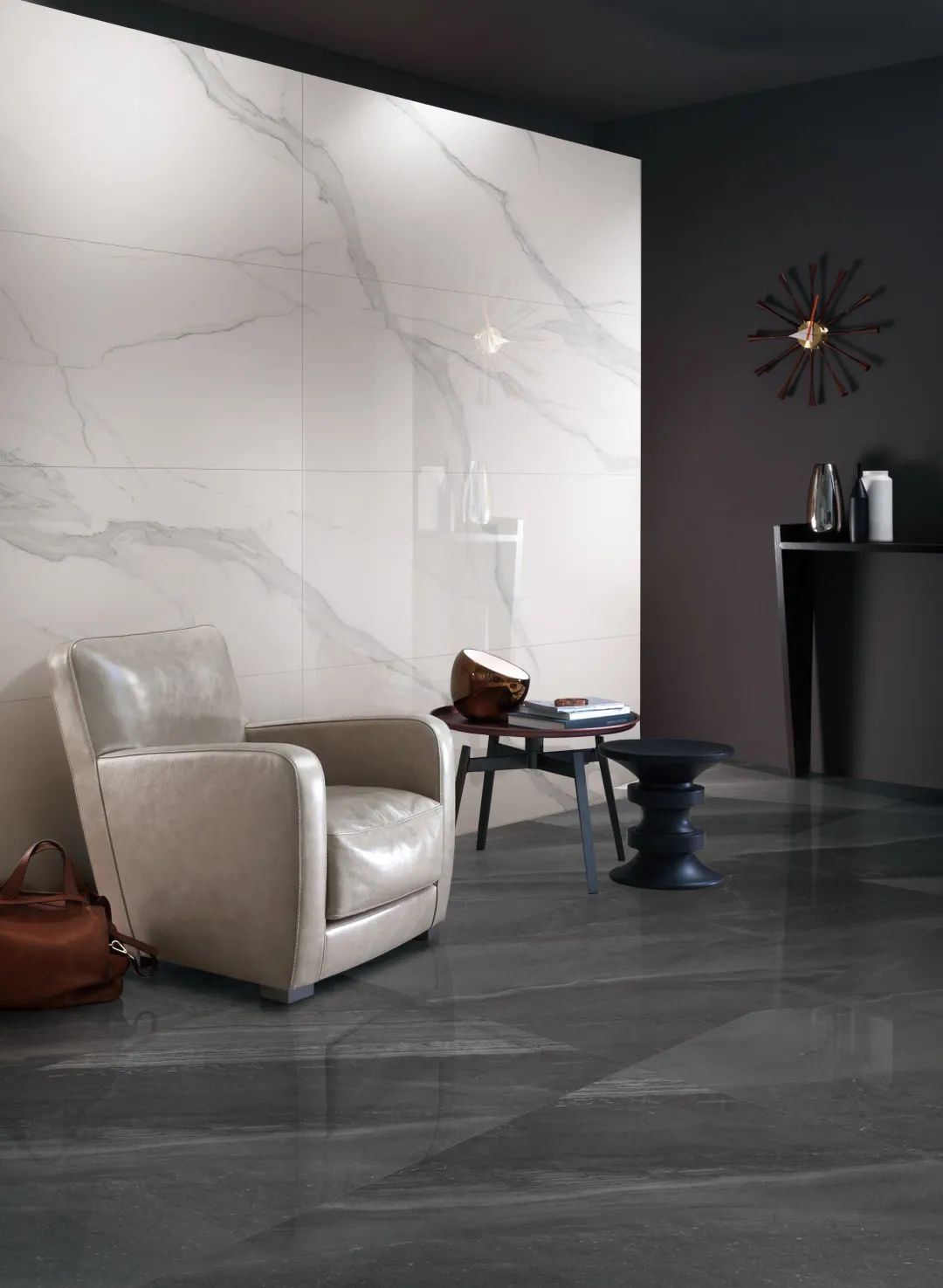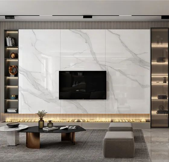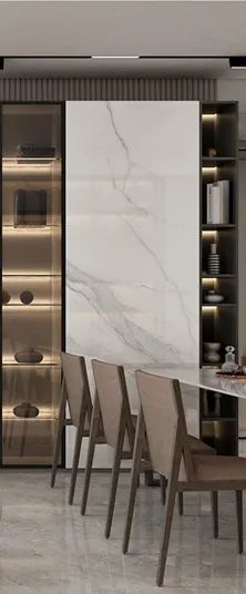 巧妙地利用大板瓷磚的多元應(yīng)用優(yōu)勢(shì)打造半開放式的電視柜,三片“魚肚白”大板裝飾柜面,連紋圖案簡(jiǎn)潔大氣,為客廳增添美感;木質(zhì)隔層用于擺放精致的藝術(shù)品,收藏品或書籍,整潔又美觀。