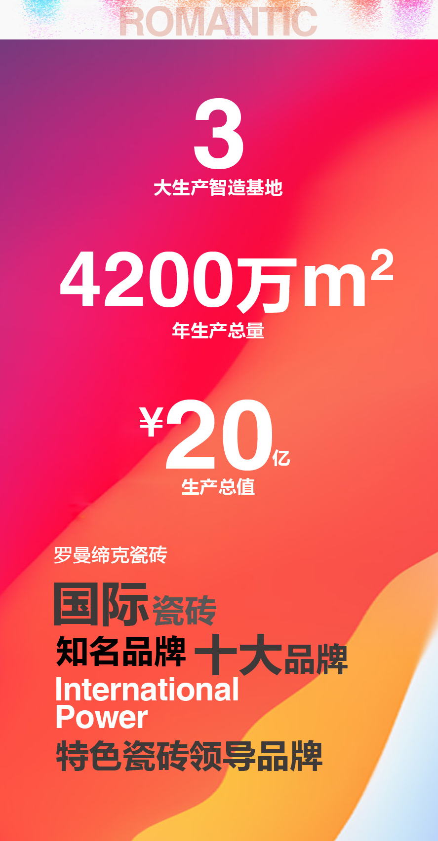 這二十一年來,羅曼締克以堅持做特色精品瓷磚為導(dǎo)向,以打造“特色瓷磚”品牌為營銷理念,獨立創(chuàng)新,技術(shù)先進,成為追求個性、引領(lǐng)時尚的國際性品牌。