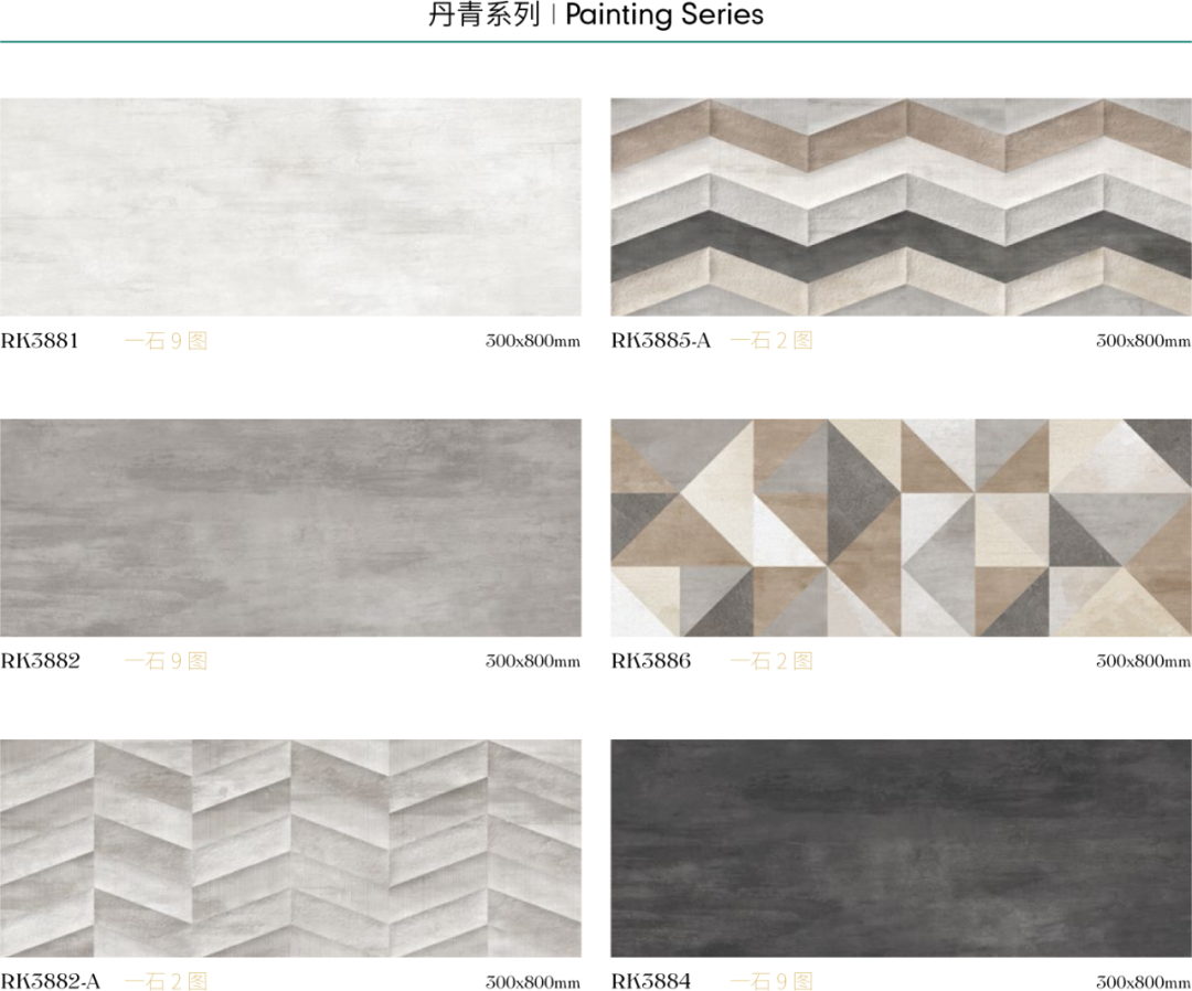 黃金比例規(guī)格300x800mm立體模具磚【丹青系列】,創(chuàng)意來源中國文房墨寶中的文化融入其中。