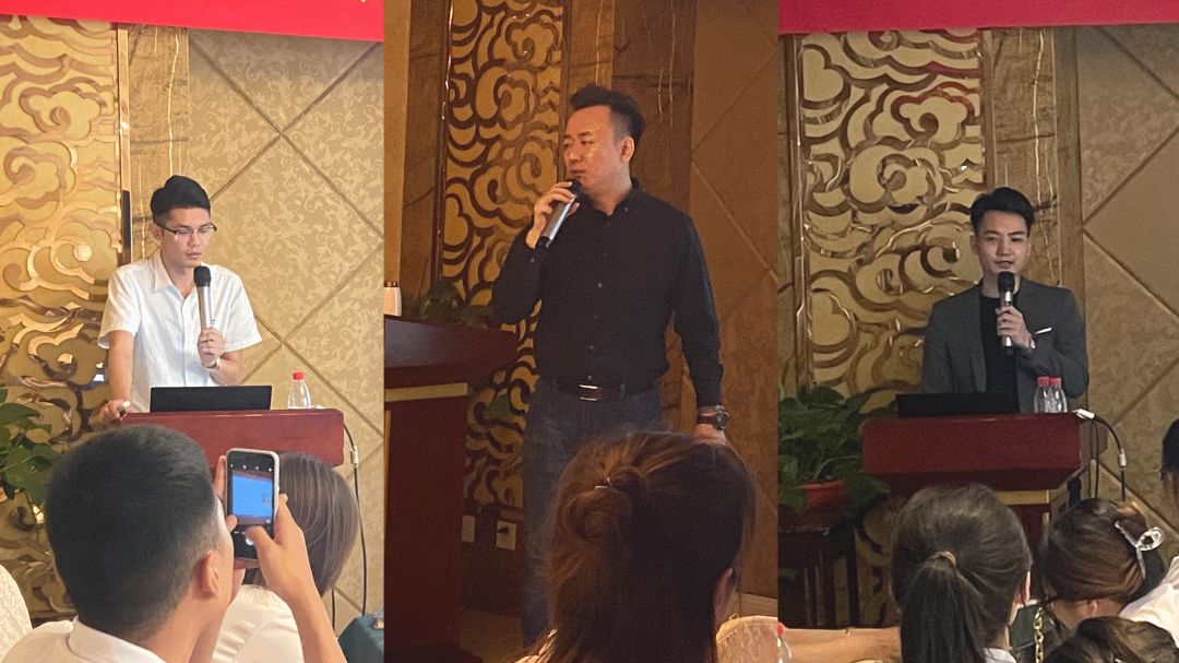 伊莉莎白瓷磚市場部王飛經理(中),帶領著研習社金牌活動培訓導師-梁智杰老師(左)、邵文旭老師(右)親臨現場授課。15門課程從品牌、產品、營銷、設計,渠道5大方面,全方位助力終端。