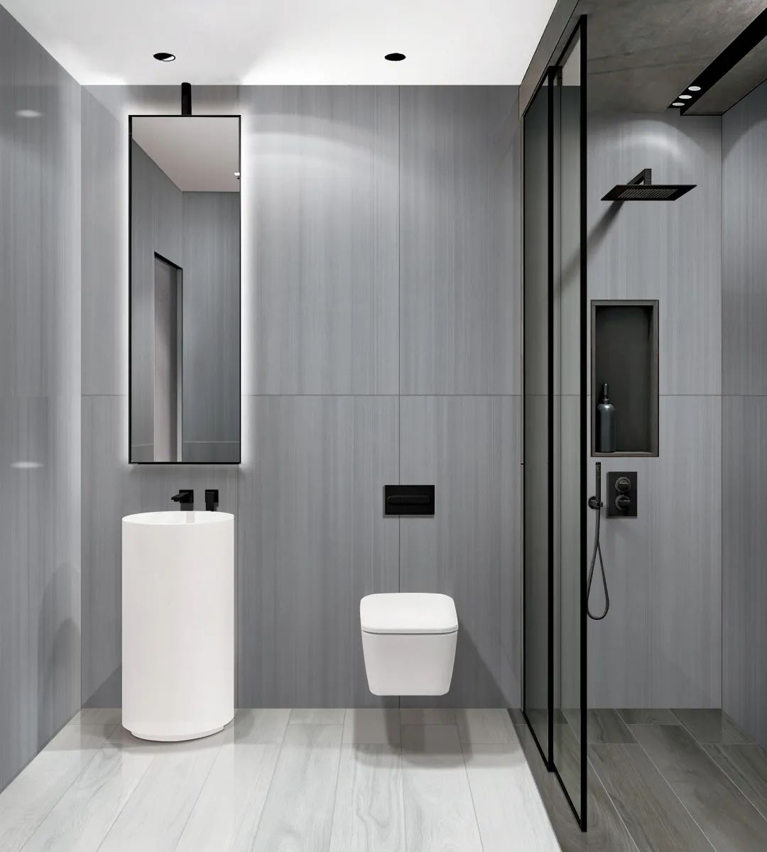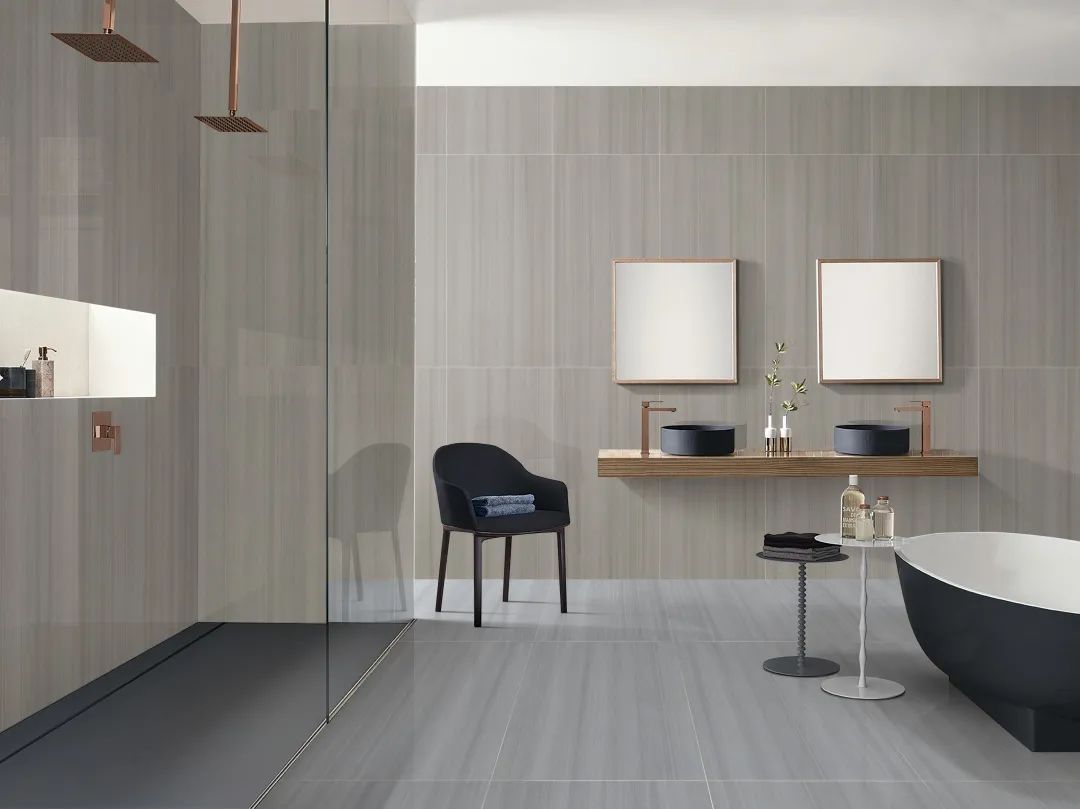 灰褐色“布洛克”營(yíng)造了衛(wèi)生間簡(jiǎn)約舒適的基調(diào),黑色軟裝家具提升空間質(zhì)感。
