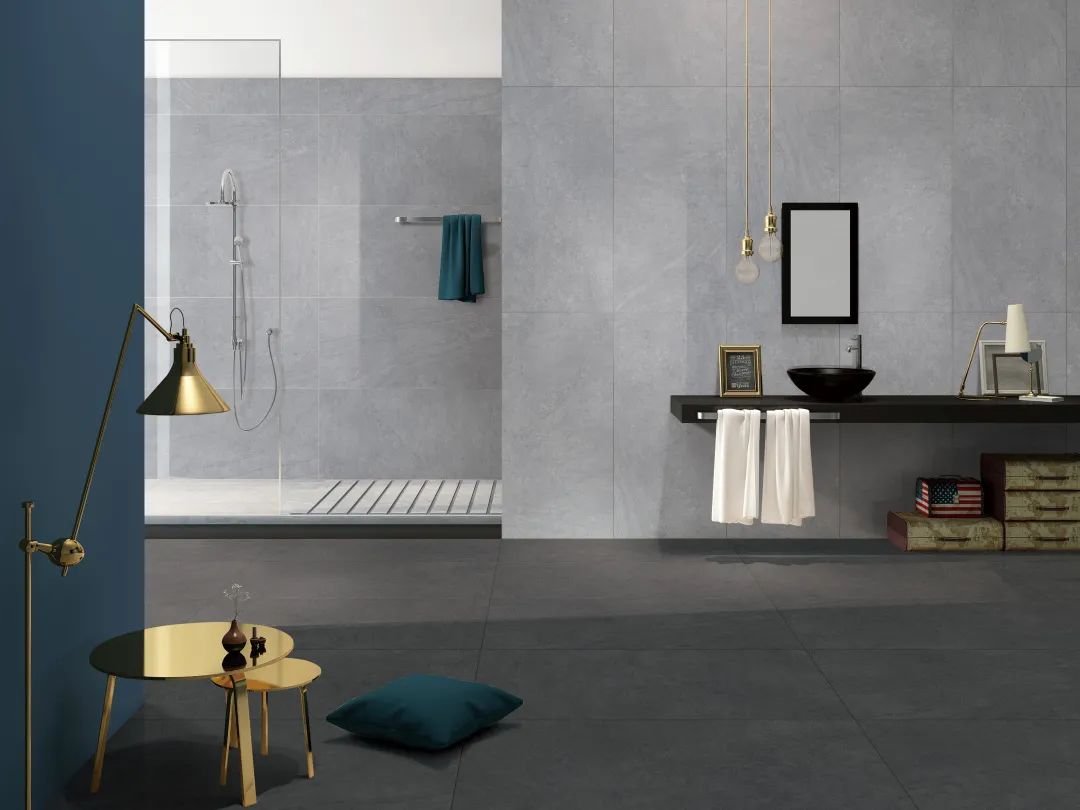 The natural and elegant "Sahara" overall pavement is full of modern texture; "Blue Enchantress" tiles are added to the decorative background wall to bring a distinct visual impact.