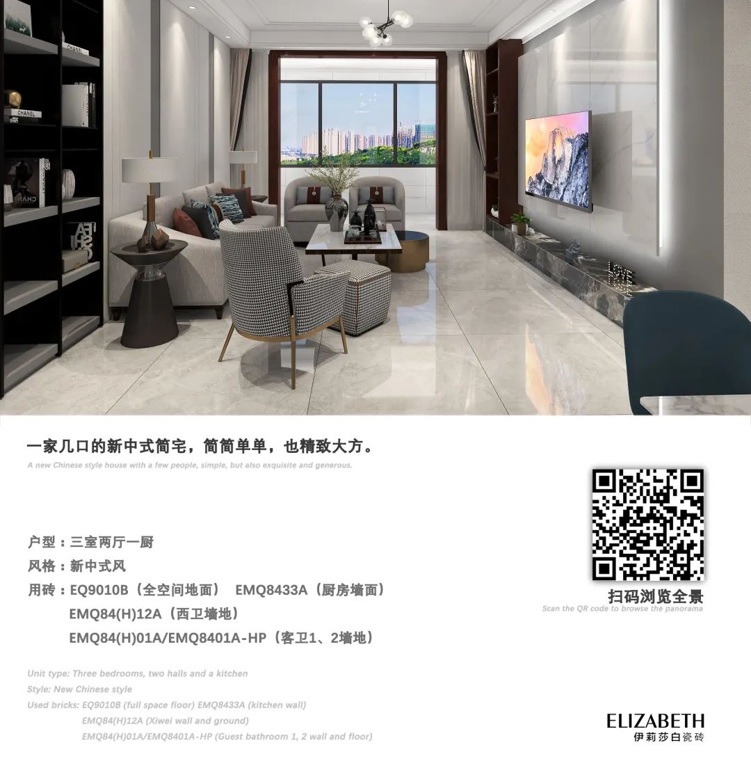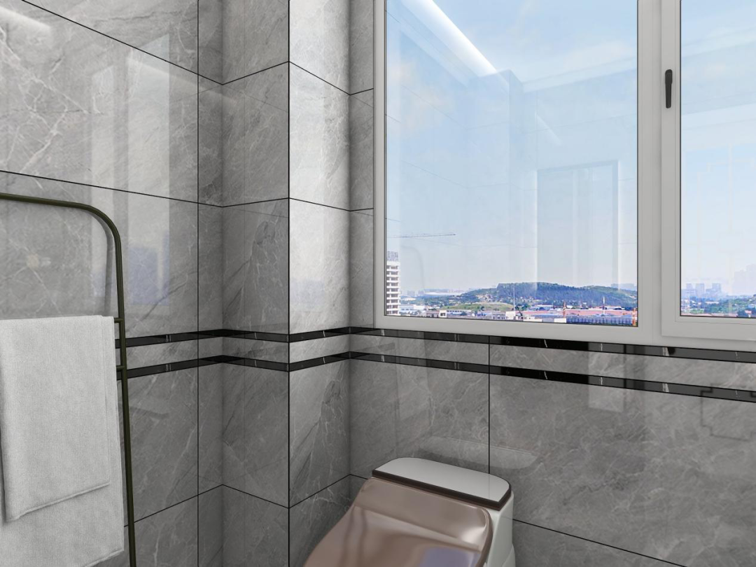 伊莉莎白瓷磚一磚多面的優(yōu)勢,輕松滿足墻地整體應(yīng)用。“卡里姆灰”亮光面上墻,柔光面鋪地,再裝飾雙行黑色線條圍繞一圈,簡約美觀。
