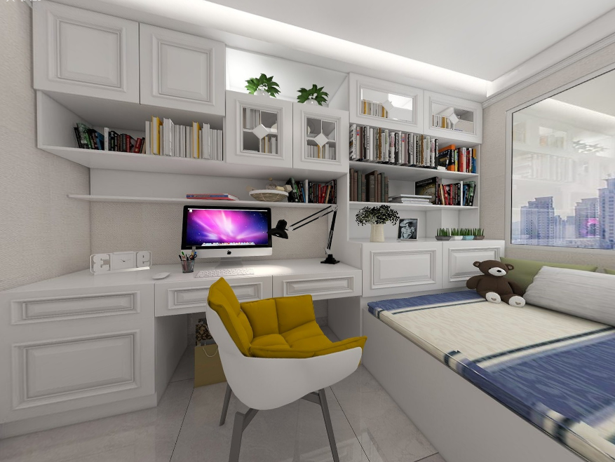 結(jié)合孩子學(xué)習(xí)、休息的需求,榻榻米+書桌一體化設(shè)計,打造多空能空間,物品集中收納,小空間也能顯得寬敞明亮。