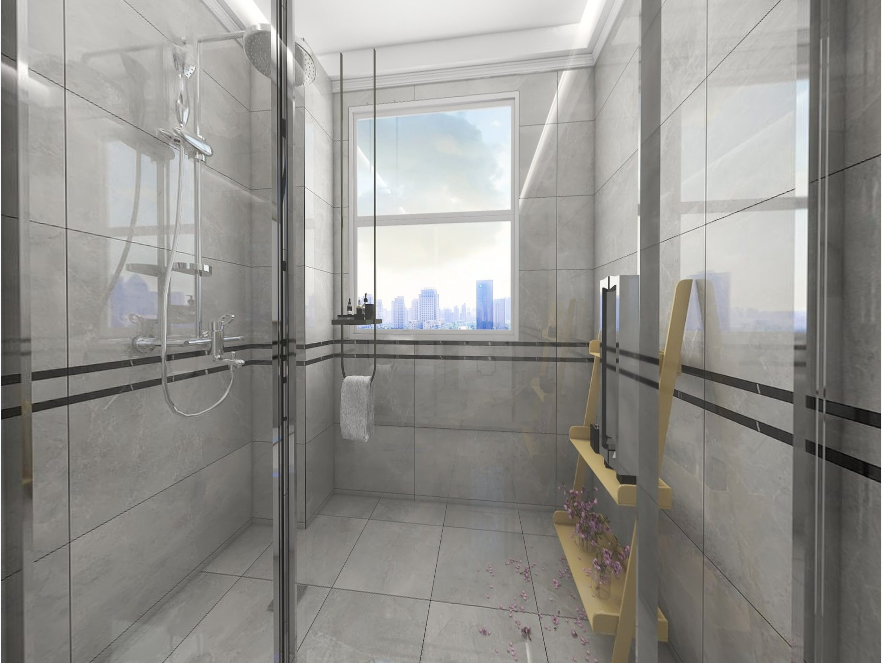 The light gray tones of the bathroom look extraordinarily clean, tidy and comfortable; the realistic small fresh green patterned tiles add vitality to the entire space.