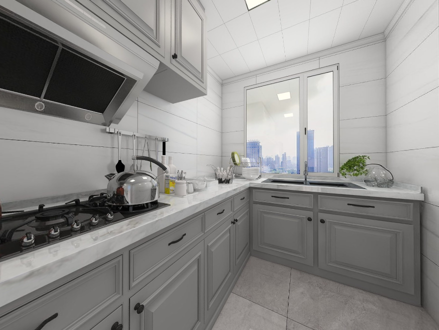 White bright "star white" wall tiles decorate the kitchen wall, which is stain-proof and easy to clean; it is also a very happy thing to cook with your lover. Choose the L-shaped kitchen design, where one person washes the dishes and cooks simultaneously.